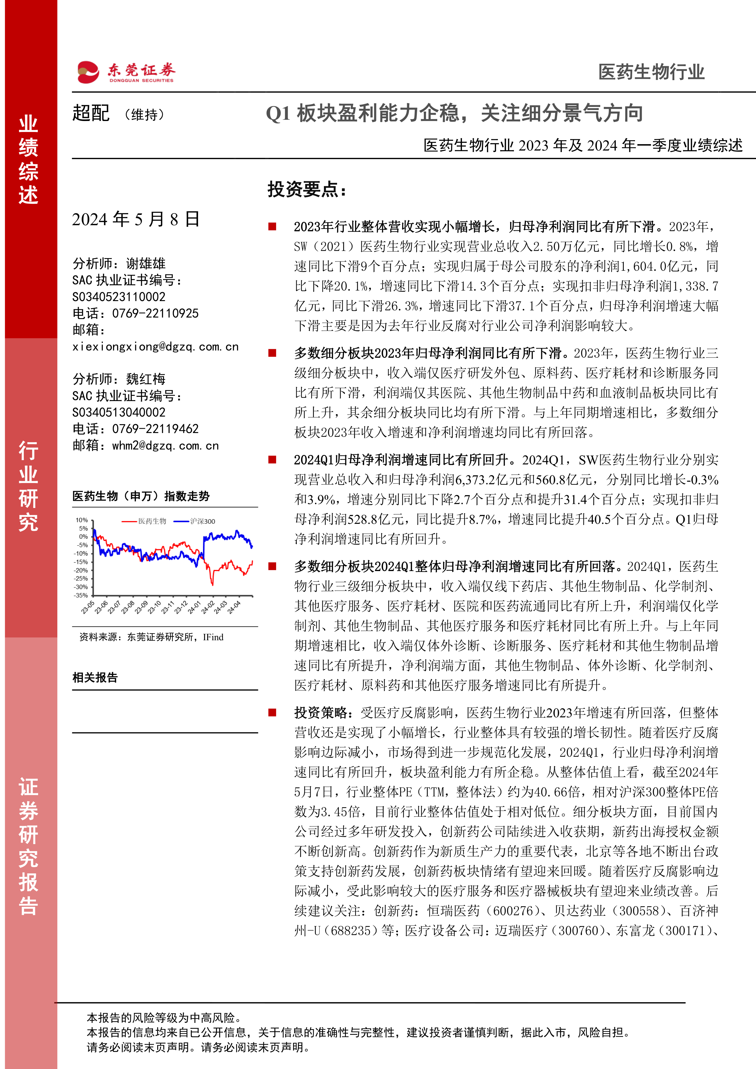 本报告根据目录结构,对医药生物行业2023年及2024年第一季度业绩进行详细的数据分析,并对重点细分板块和公司进行深入解读。