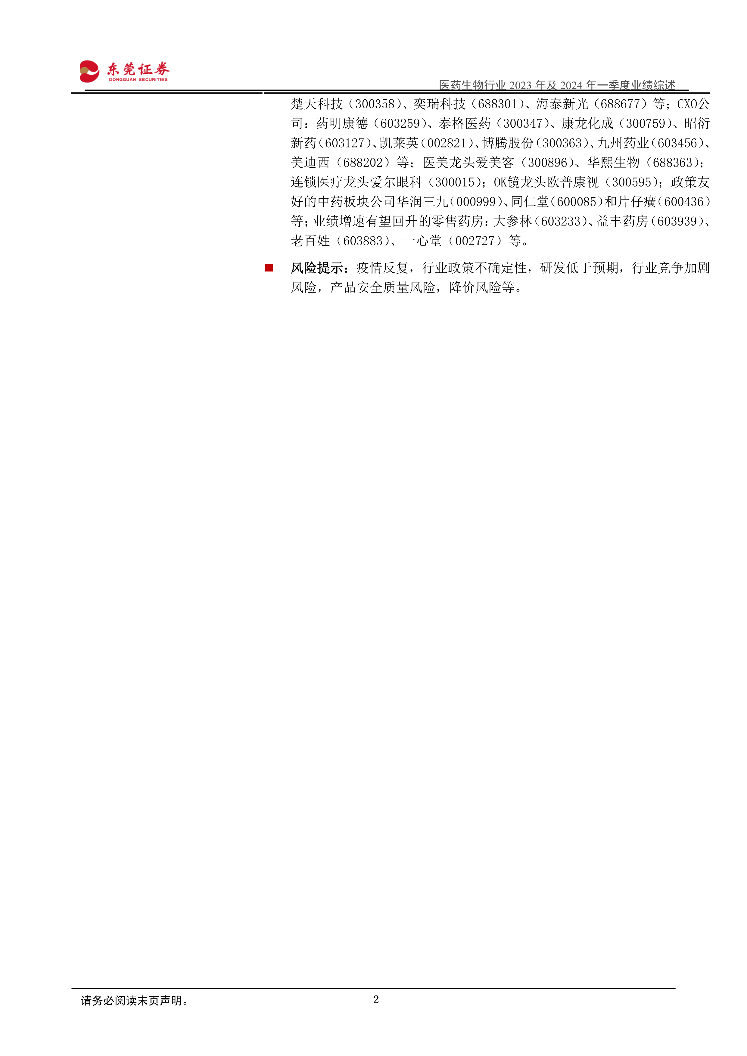报告最后列出了投资医药生物行业可能面临的风险,包括疫情反复、行业政策不确定性、研发低于预期、行业竞争加剧、产品安全质量风险、降价风险等,提醒投资者谨慎投资。
