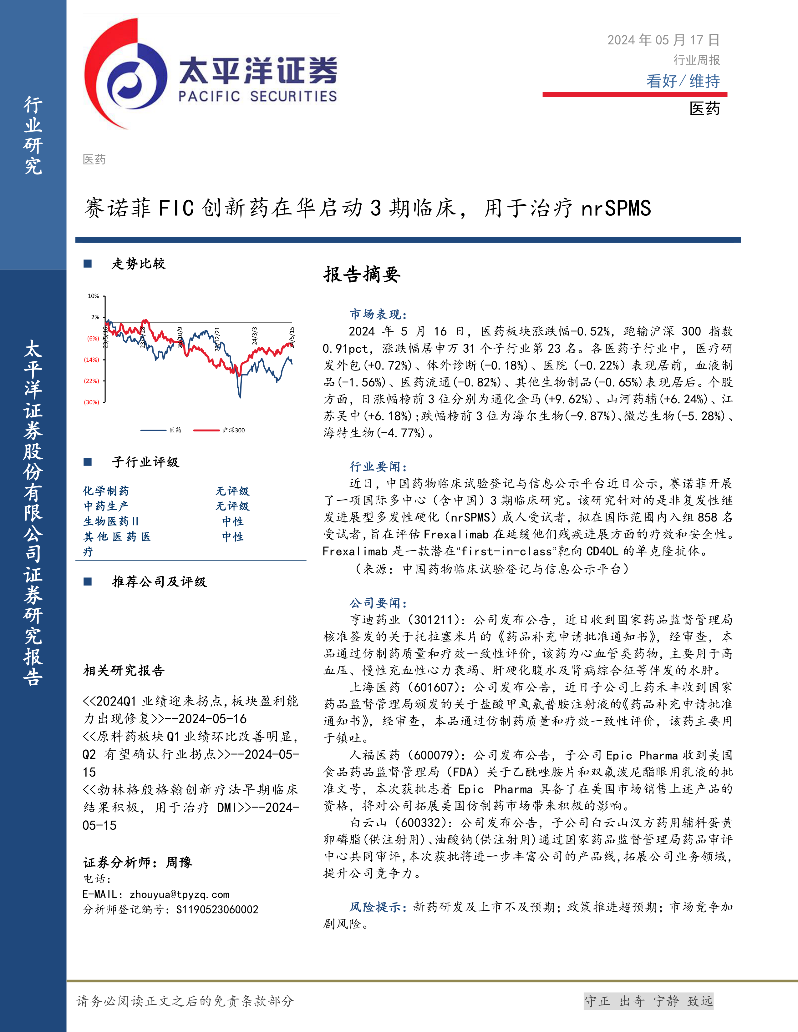 医药行业周报:赛诺菲FIC创新药在华启动3期临床,用于治疗nrSPMS