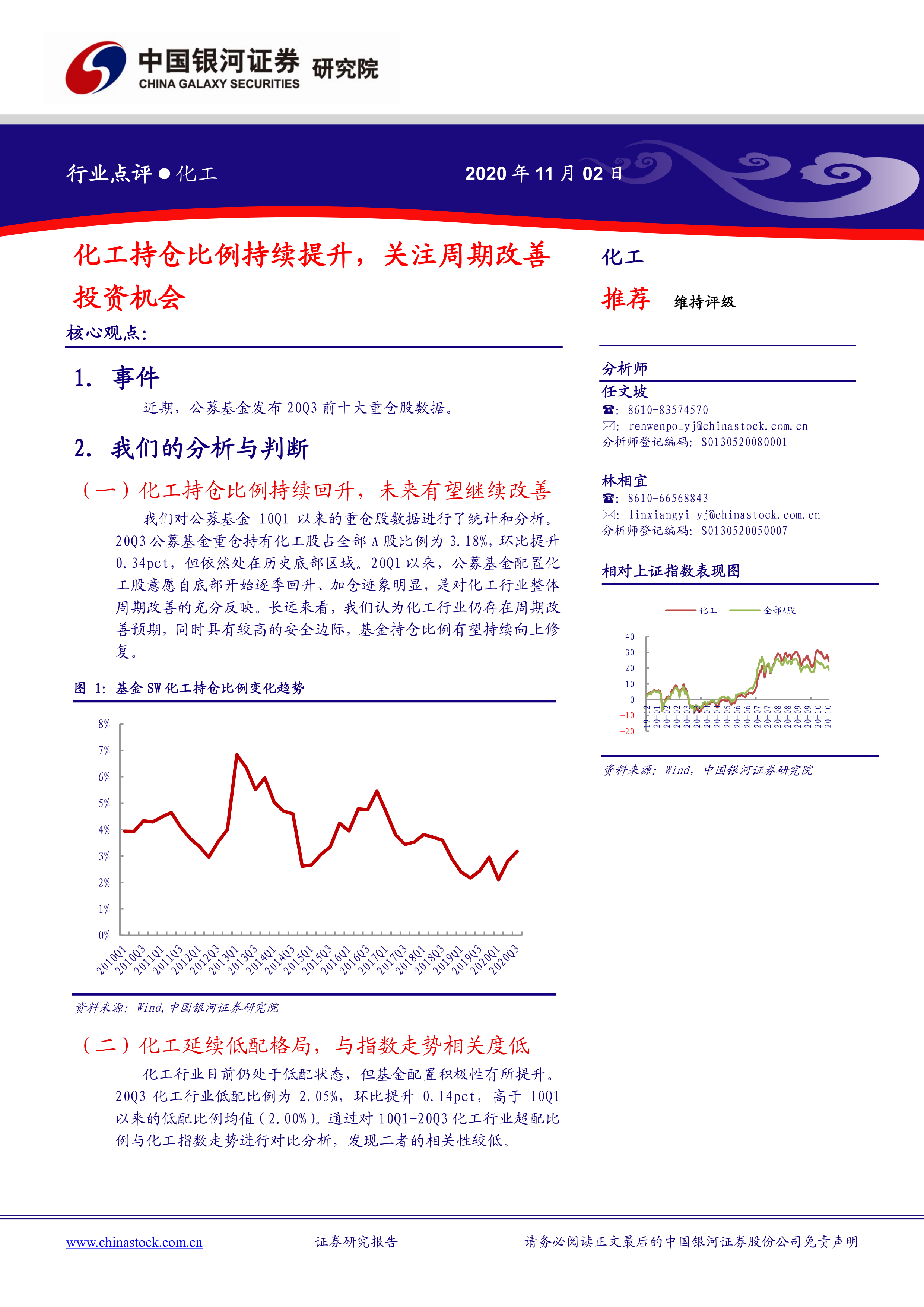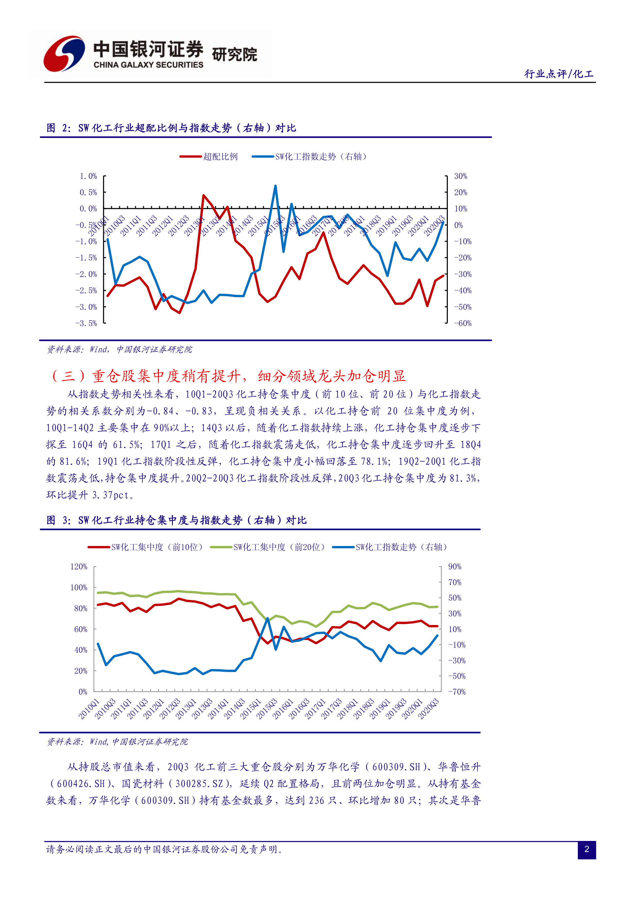 本报告基于2020年第三季度公募基金重仓股数据,对化工行业进行了深入分析。报告指出,化工行业持仓比例持续回升,但仍处于低配状态,且与指数走势的相关性较低。部分细分领域龙头企业受到基金的明显加仓,呈现结构性投资机会。报告建议投资者关注粘胶短纤、纯碱、低成本产能扩张以及周期底部石油加工领域的投资机会,并提示了油价波动、产品价差下降、营收不及预期等风险。 报告数据主要来源于Wind数据库,并由中国银河证券研究院提供。 投资者需谨慎参考,并进行独立判断。