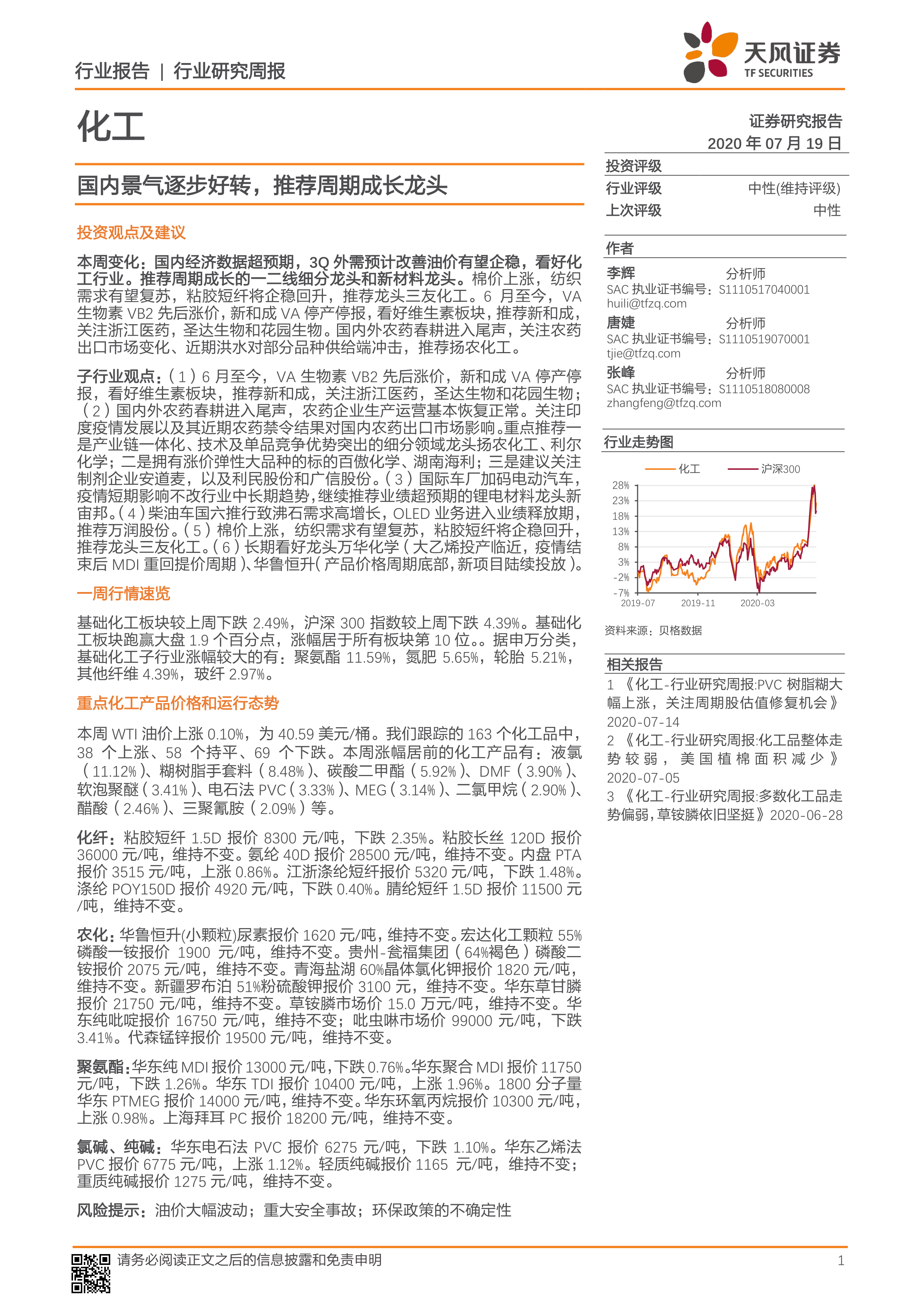 本周变化:国内经济数据超预期,3Q外需预计改善油价有望企稳,看好化工行业。推荐周期成长的一二线细分龙头和新材料龙头。棉价上涨,纺织需求有望复苏,粘胶短纤将企稳回升,推荐龙头三友化工。6月至今,VA生物素VB2先后涨价,新和成VA停产停报,看好维生素板块,推荐新和成,关注浙江医药,圣达生物和花园生物。国内外农药春耕进入尾声,关注农药出口市场变化、近期洪水对部分品种供给端冲击,推荐扬农化工。