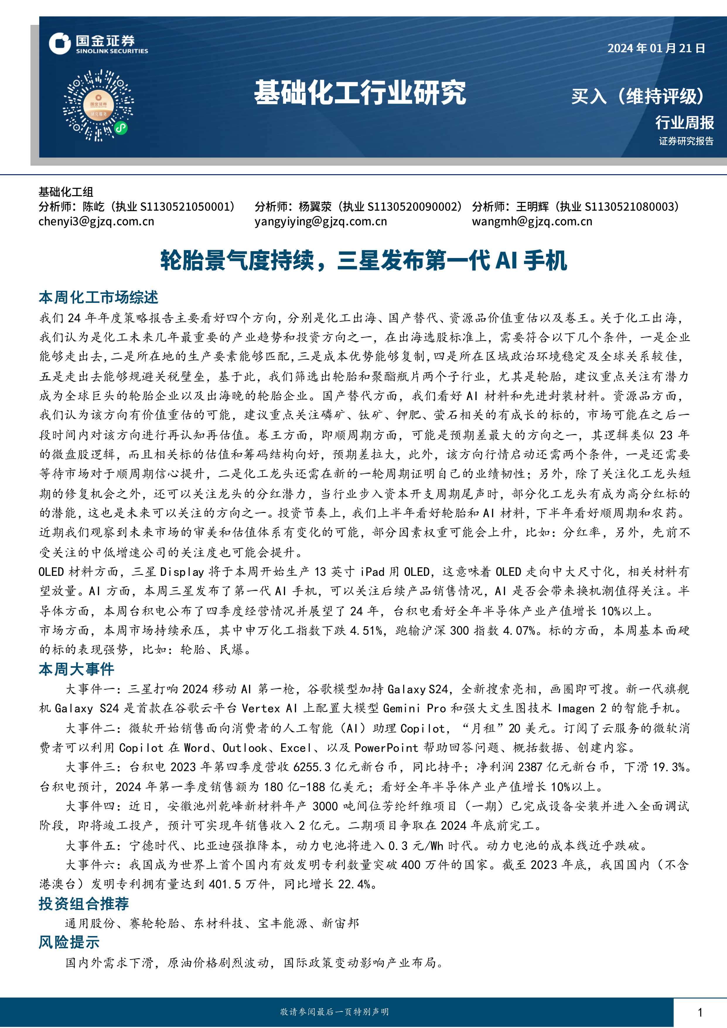 基础化工行业研究:轮胎景气度持续,三星发布第一代AI手机