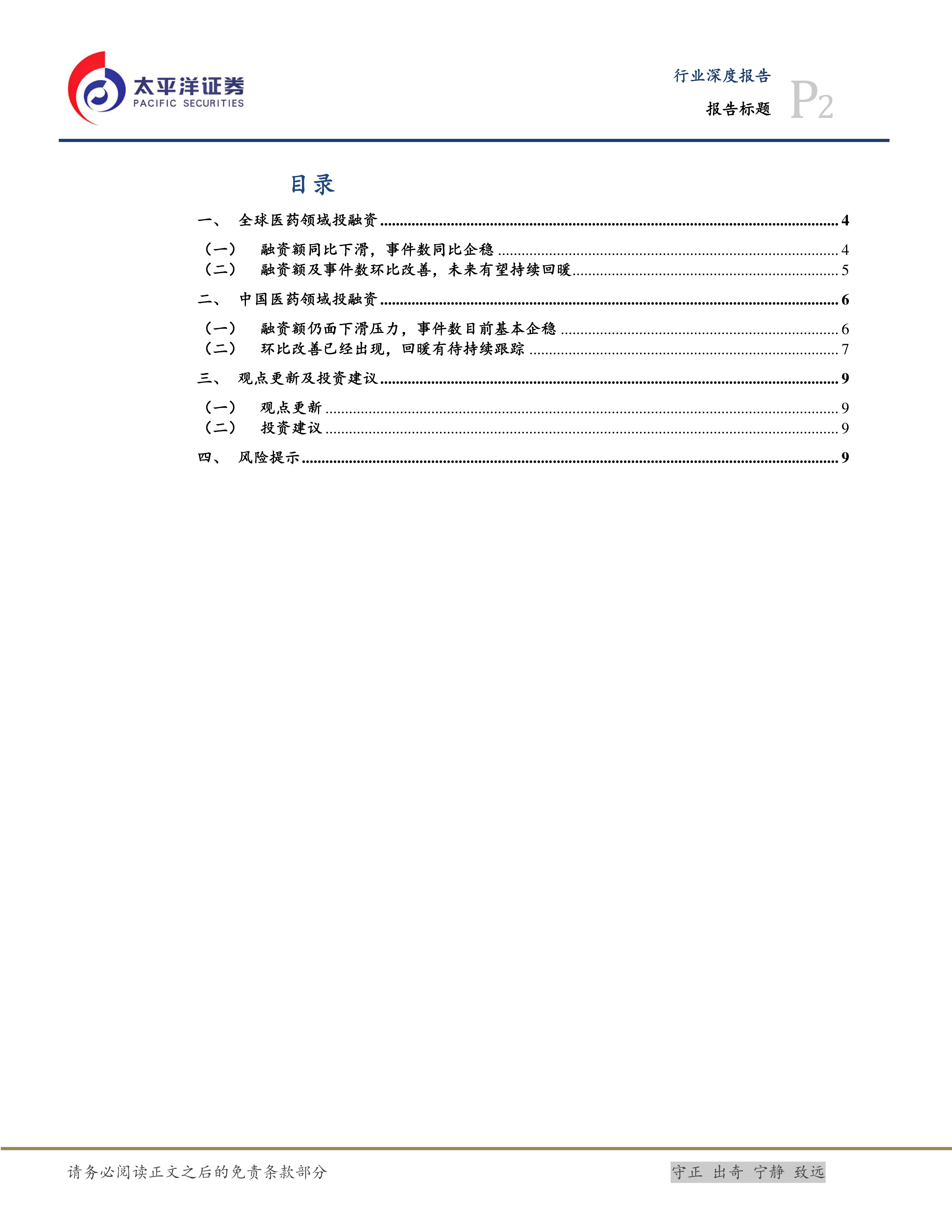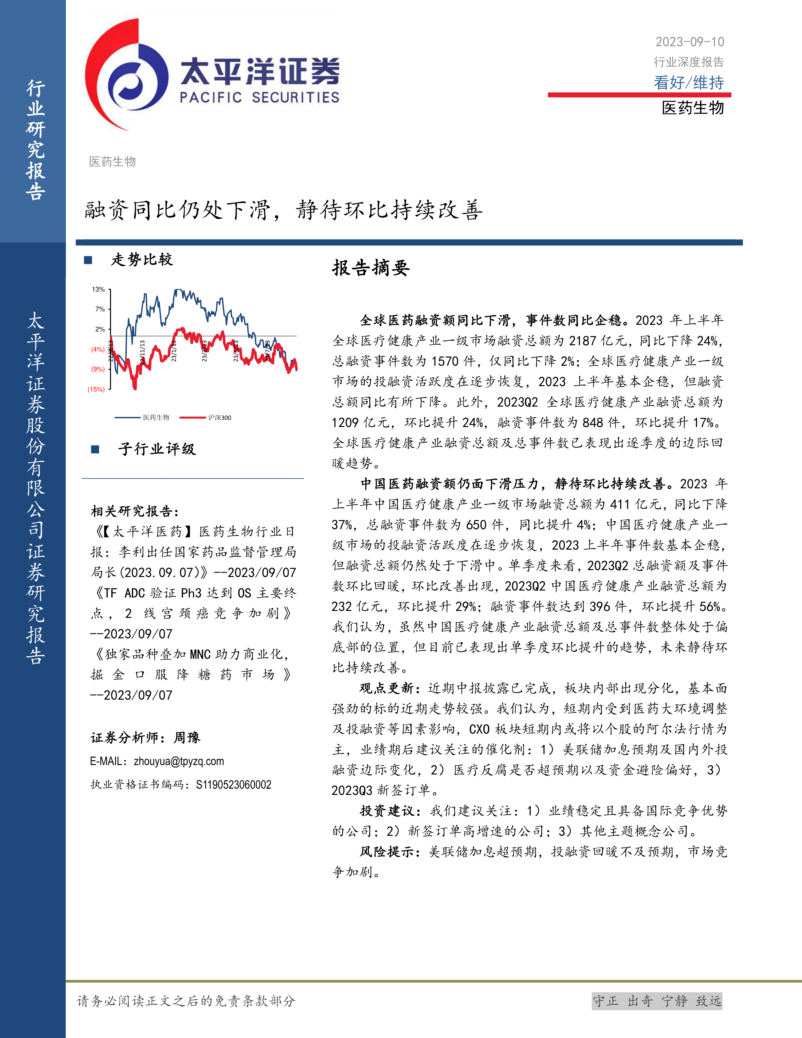 本报告的核心观点是:2023年上半年全球和中国医药生物领域的投融资市场均呈现出同比下滑的趋势,但环比数据显示出积极的改善迹象。全球市场融资事件数基本企稳,中国市场融资事件数甚至有所增长。 未来,医药生物领域的投融资市场有望持续回暖,但仍需关注潜在风险。
