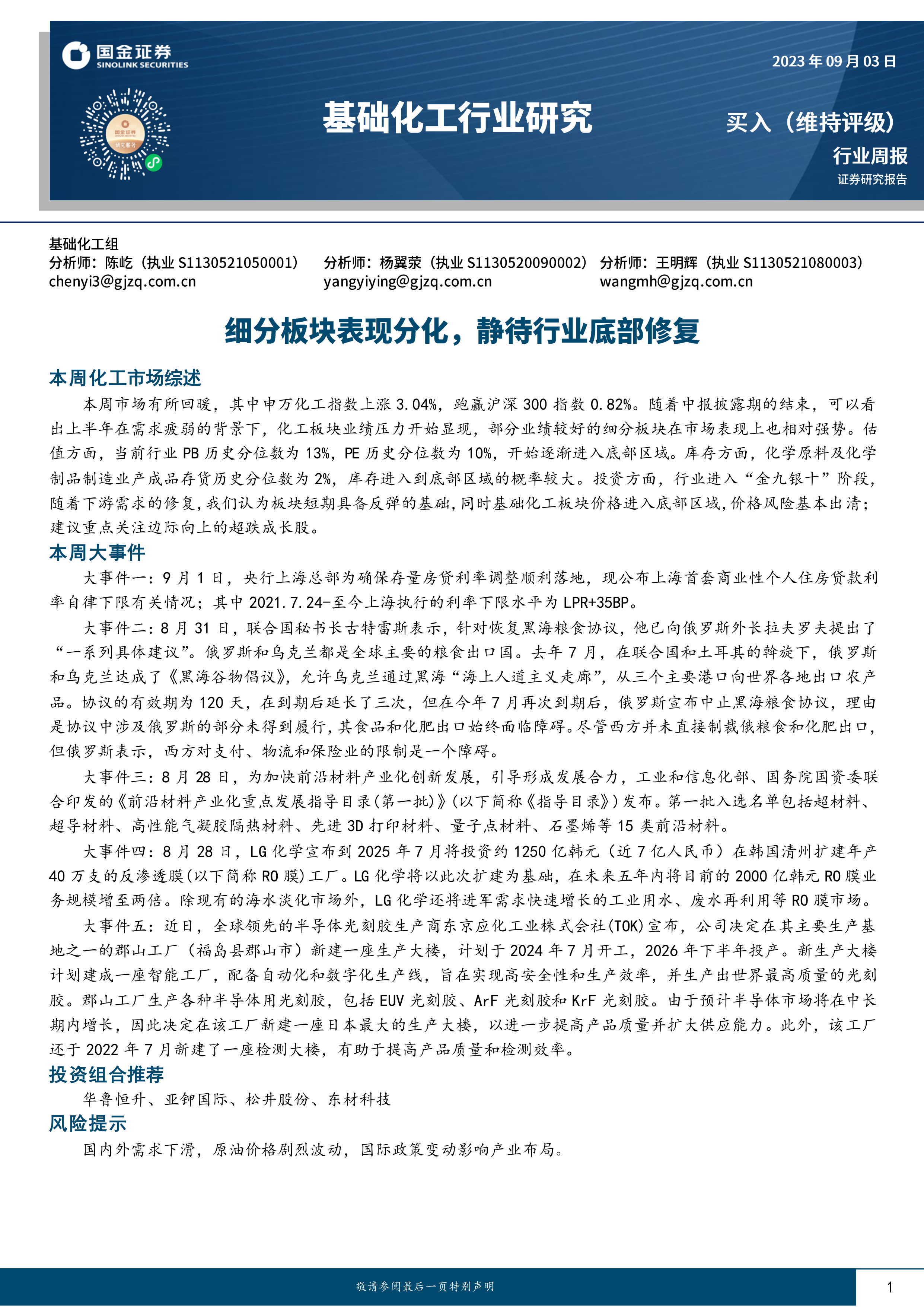 基础化工行业研究:细分板块表现分化,静待行业底部修复