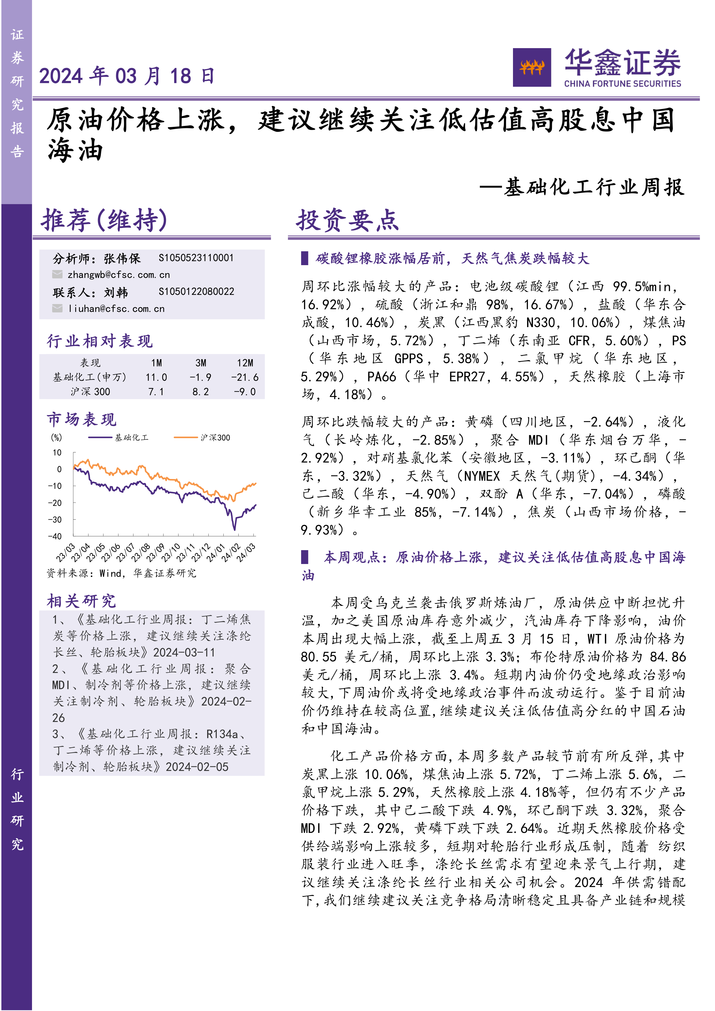 本报告基于市场数据和行业分析,对2024年3月18日化工行业及相关上市公司进行了全面分析。原油价格上涨是本周化工市场的主要驱动因素,导致部分产品价格反弹,但市场整体波动较大。报告建议投资者关注低估值高股息的中国海油,以及在2024年供需错配背景下,具备竞争优势的聚氨酯、煤化工、涤纶长丝和轮胎行业相关公司。 报告中提供的详细数据和图表,有助于投资者更深入地了解化工市场动态,做出更明智的投资决策。 然而,投资者仍需注意报告中提到的风险提示,并进行独立的风险评估。