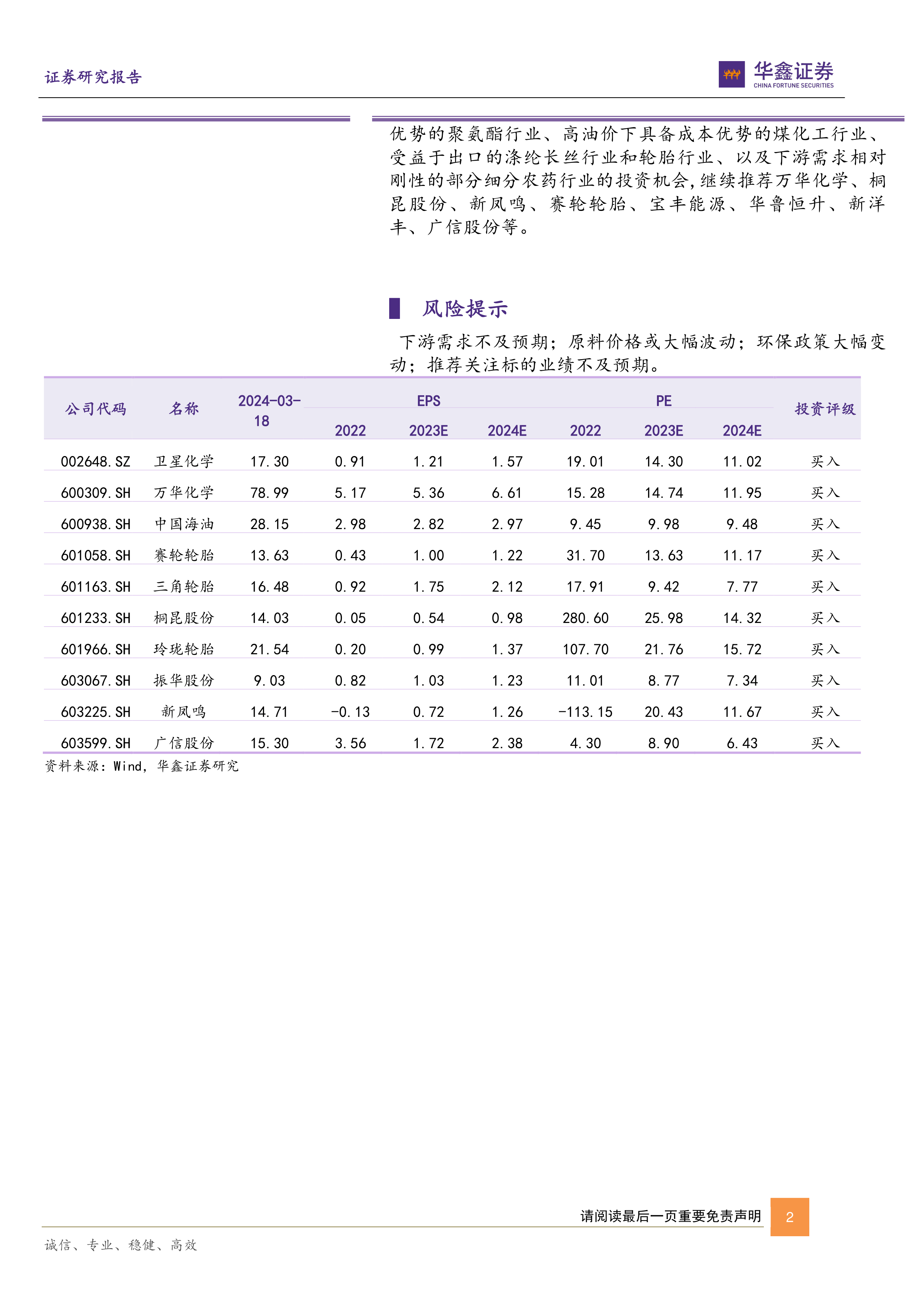 化工产品价格方面,本周多数产品较节前有所反弹,其中炭黑上涨10.06%,煤焦油上涨5.72%,丁二烯上涨5.6%,二氯甲烷上涨5.29%,天然橡胶上涨4.18%等,但仍有不少产品价格下跌,其中己二酸下跌4.9%,环己酮下跌3.32%,聚合MDI下跌2.92%,黄磷下跌下跌2.64%。近期天然橡胶价格受供给端影响上涨较多,短期对轮胎行业形成压制,随着纺织服装行业进入旺季,涤纶长丝需求有望迎来景气上行期,建议继续关注涤纶长丝行业相关公司机会。2024年供需错配下,我们继续建议关注竞争格局清晰稳定且具备产业链和规模优势的聚氨酯行业、高油价下具备成本优势的煤化工行业、受益于出口的涤纶长丝行业和轮胎行业、以及下游需求相对刚性的部分细分农药行业的投资机会,继续推荐万华化学、桐昆股份、新凤鸣、赛轮轮胎、宝丰能源、华鲁恒升、新洋丰、广信股份等。