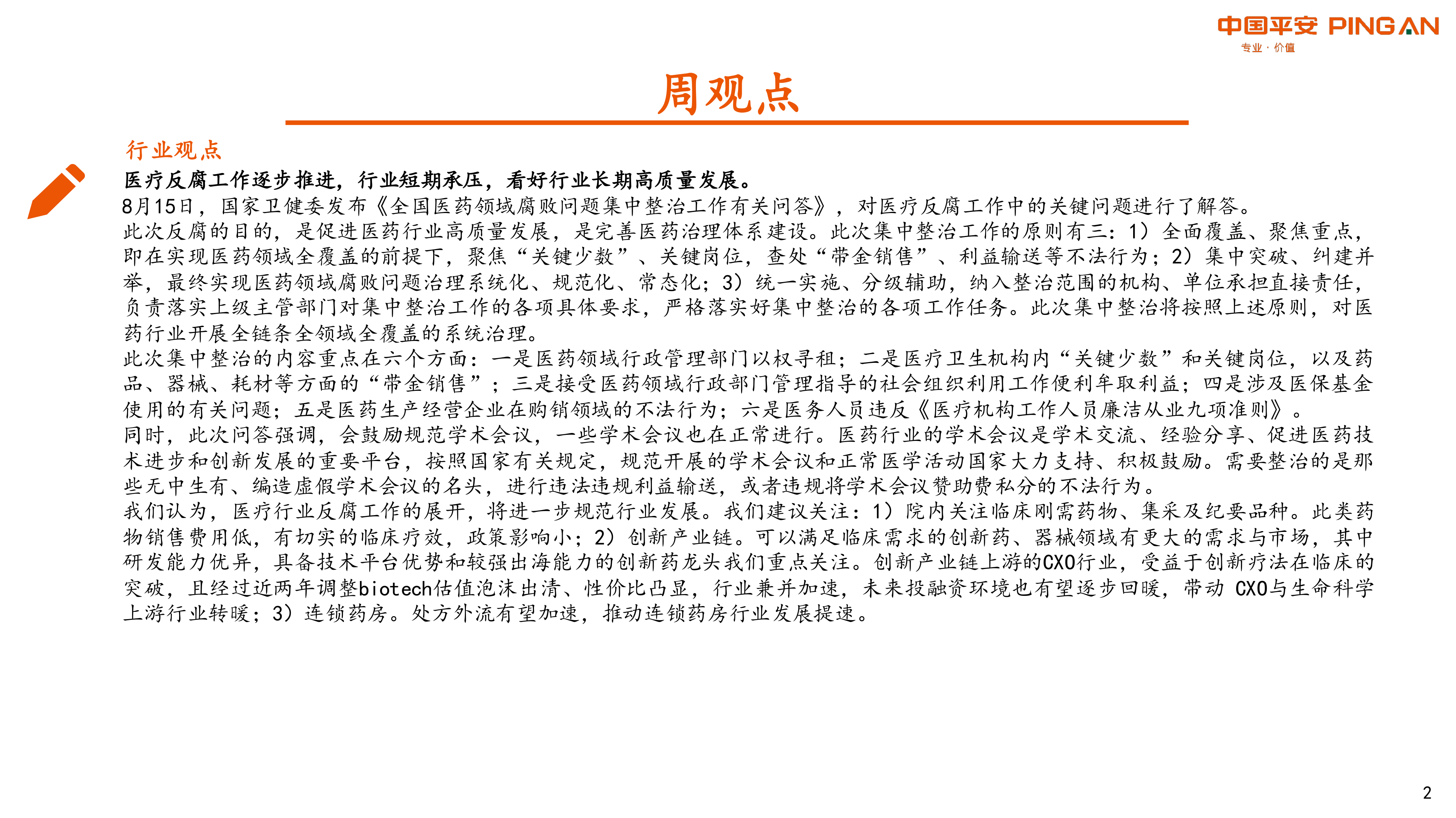 本报告的核心观点是:医疗反腐工作短期内将对医药行业造成一定压力,但长期来看,这将促进医药行业高质量发展。报告建议投资者关注以下几个领域:临床刚需药物、创新产业链(包括创新药龙头企业和CXO行业)、连锁药房、以及短期受挫后有望边际改善的板块(如CXO&生命科学上游、疫苗、消费升级可选医疗)。