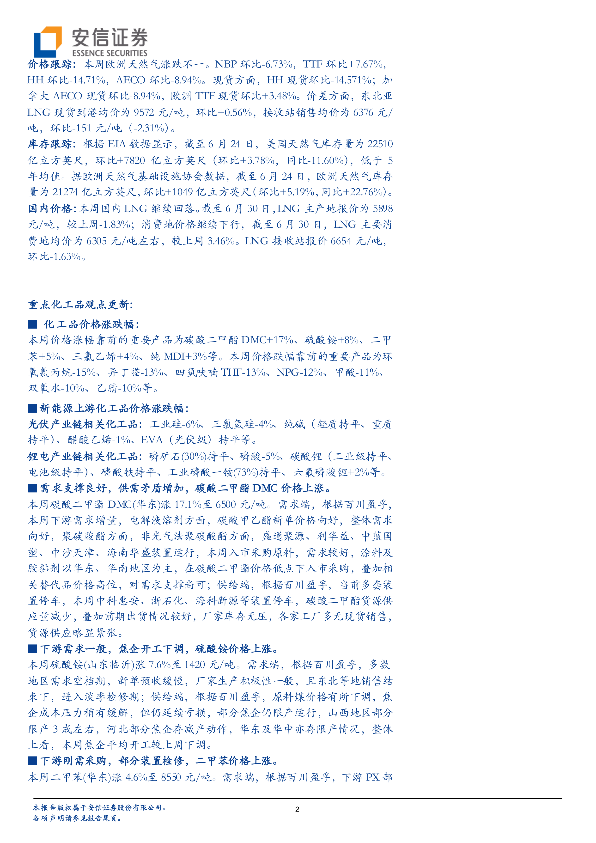 本报告的核心观点是:本周基础化工行业整体表现受原油价格波动和地缘政治因素影响显著。部分化工产品价格上涨,主要受下游需求增长和供应收紧的驱动;而另一些产品价格下跌,则与下游需求疲软和供应增加有关。 报告重点分析了碳酸二甲酯(DMC)、硫酸铵、二甲苯、三氯乙烯和纯MDI等产品的价格波动原因,并对未来市场走势进行了初步预测。 同时,报告也关注了新能源上游化工品的价格变化,以及石油化工行业受国际油价波动的影响。