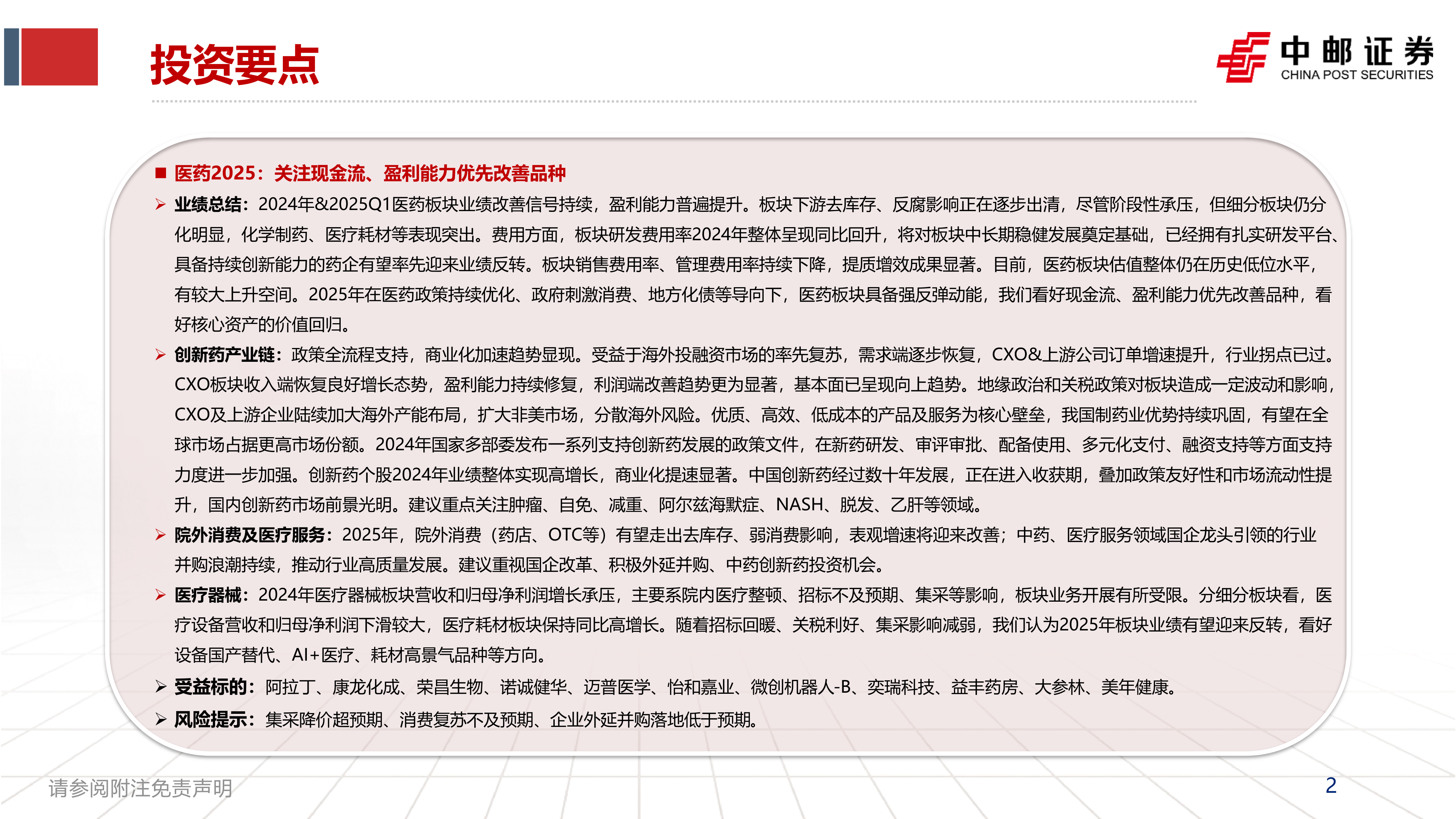 院外消费及医疗服务:2025年,院外消费(药店、OTC等)有望走出去库存、弱消费影响,表观增速将迎来改善;中药、医疗服务领域国企龙头引领的行业并购浪潮持续,推动行业高质量发展。建议重视国企改革、积极外延并购、中药创新药投资机会。
