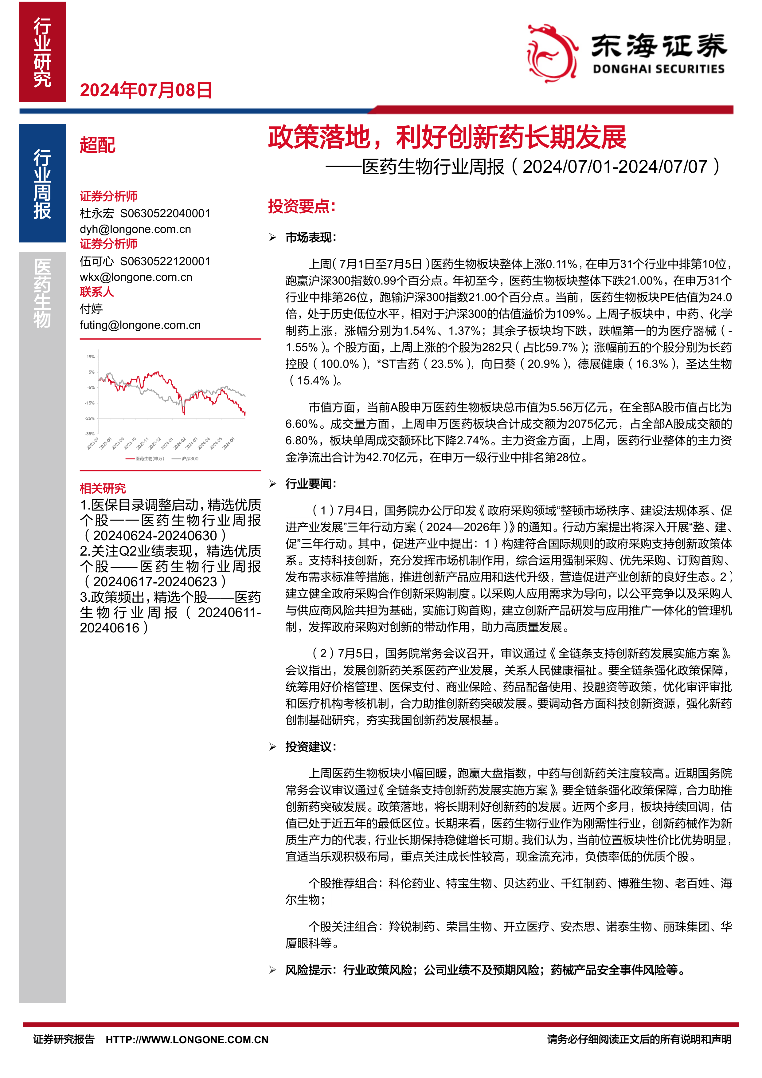 上周(7月1日至7月5日)医药生物板块整体上涨0.11%,在申万31个行业中排第10位,跑赢沪深300指数0.99个百分点。年初至今,医药生物板块整体下跌21.00%,在申万31个行业中排第26位,跑输沪深300指数21.00个百分点。当前,医药生物板块PE估值为24.0倍,处于历史低位水平,相对于沪深300的估值溢价为109%。上周子板块中,中药、化学制药上涨,涨幅分别为1.54%、1.37%;其余子板块均下跌,跌幅第一的为医疗器械(-1.55%)。个股方面,上周上涨的个股为282只(占比59.7%);涨幅前五的个股分别为长药控股(100.0%),*ST吉药(23.5%),向日葵(20.9%),德展健康(16.3%),圣达生物(15.4%)。