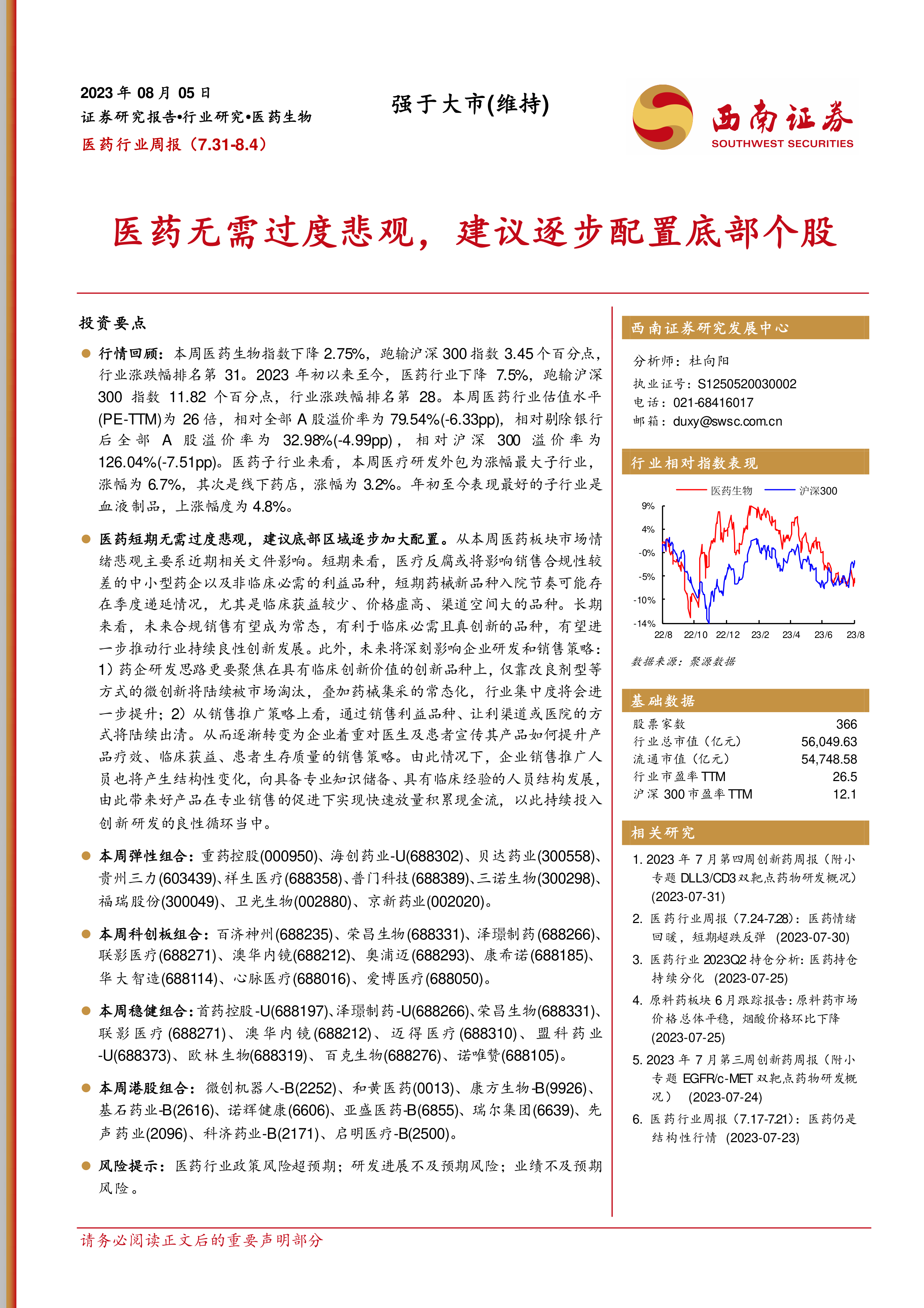 本报告基于市场数据和公开信息,对医药行业近期表现、投资策略以及未来发展趋势进行了专业分析。尽管短期内医疗反腐政策带来市场波动,但长期来看,行业发展前景依然向好,建议投资者关注临床必需且真正创新的品种,并根据自身风险偏好选择合适的投资组合。 报告中提供的投资组合和个股信息仅供参考,投资者应独立判断并承担投资风险。