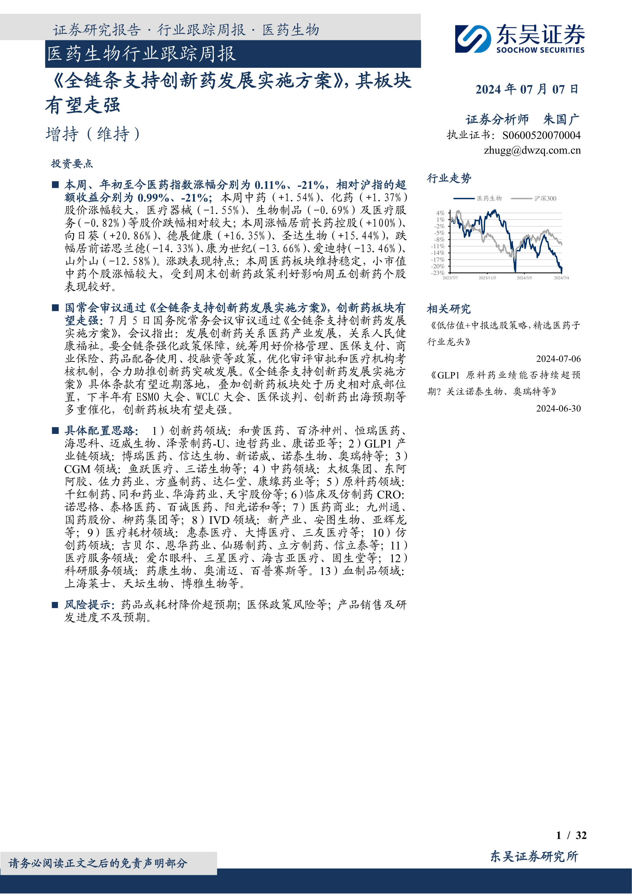 医药生物行业跟踪周报:《全链条支持创新药发展实施方案》,其板块有望走强