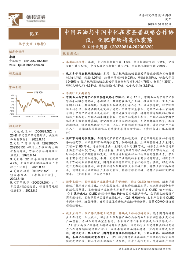 本周板块行情: 本周,上证综合指数下跌 1.8%,创业板指数下跌 3.11%,沪深300 下跌 2.58%,中信基础化工指数下跌 2.7%,申万化工指数下跌 2.38%。