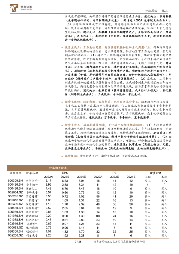 报告基于市场分析,提出了五条值得关注的化工行业投资主线,并分别推荐了相关标的股票: