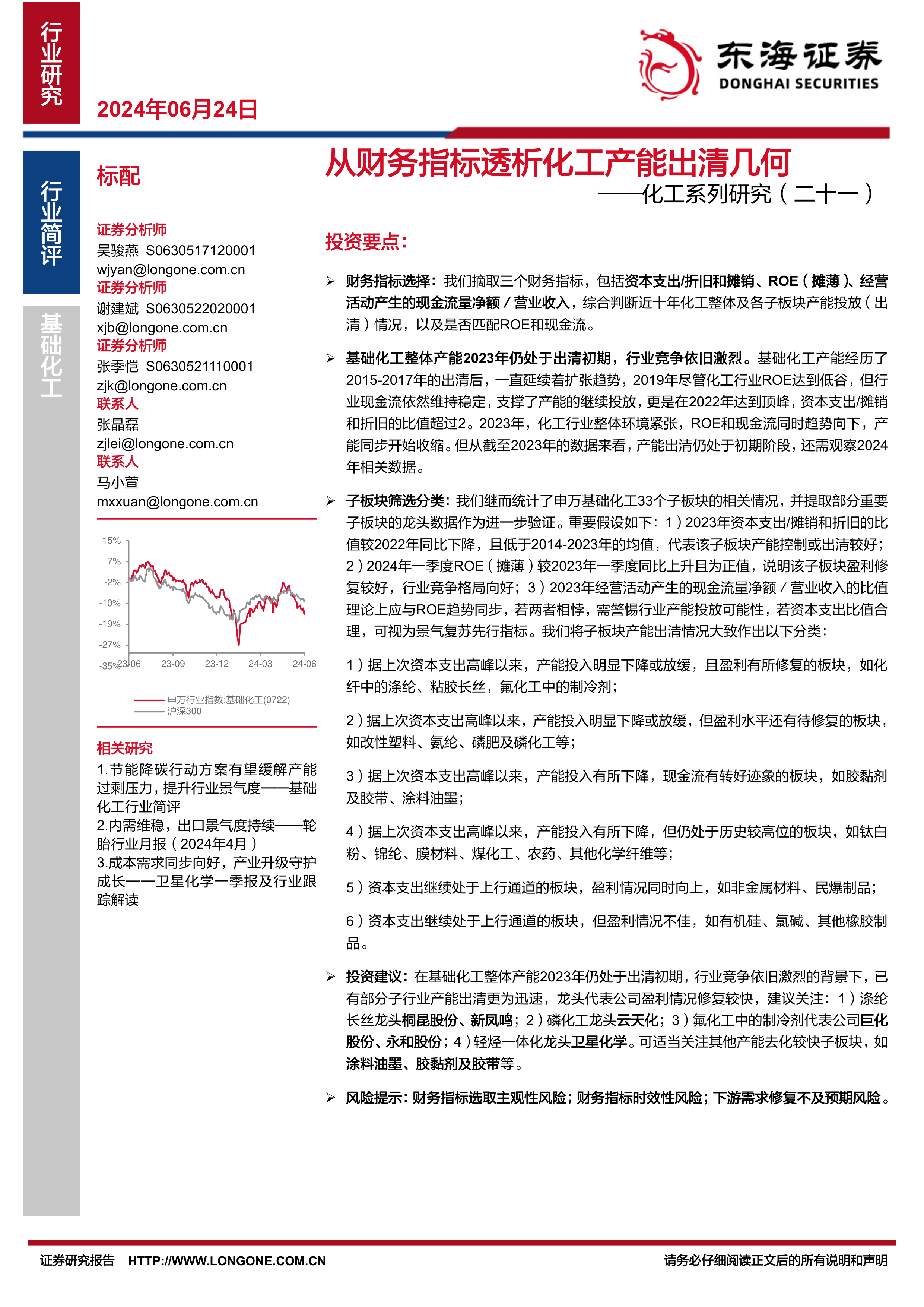 本报告通过对资本支出、ROE和现金流三个关键财务指标的综合分析,对中国化工行业产能出清情况进行了深入研究。报告发现,2023年化工行业整体产能出清仍处于初期阶段,但不同子板块的产能出清速度和盈利修复情况差异显著。部分子板块的龙头企业盈利修复较快,为投资者提供了潜在的投资机会。 然而,投资者也需要关注报告中指出的风险因素,并进行独立的投资判断。 未来,持续关注2024年的数据变化,将有助于更准确地评估化工行业产能出清的进程和行业景气度的恢复情况。