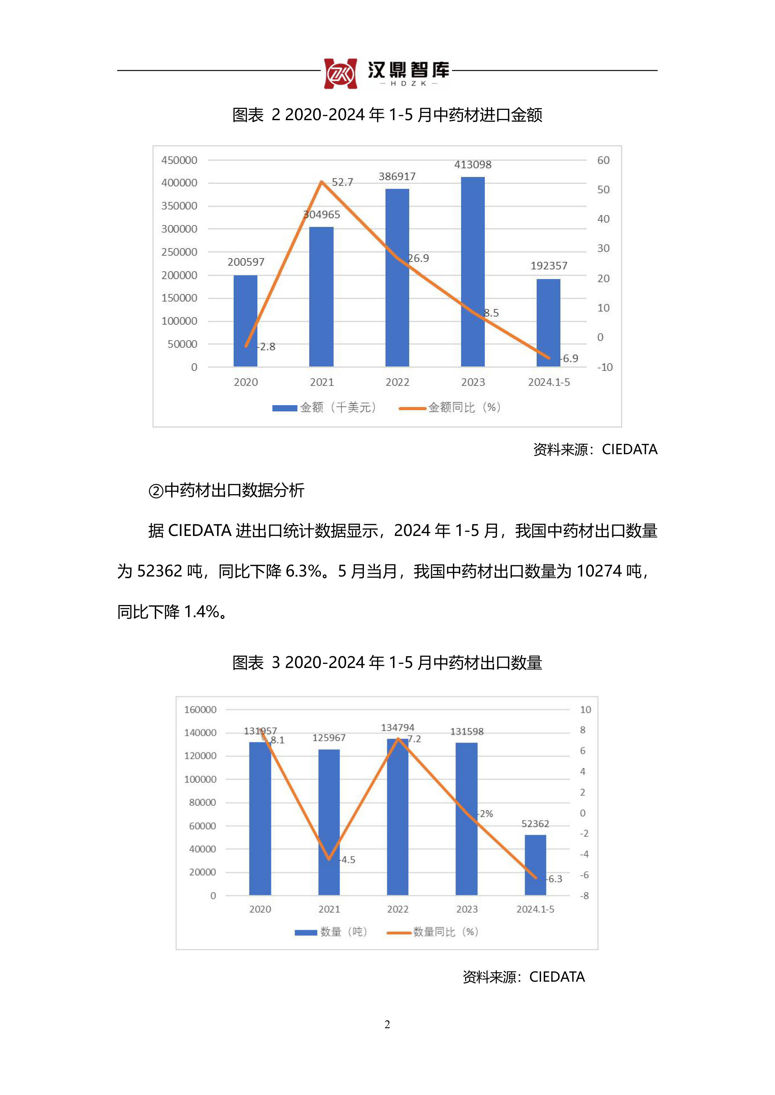 2024年1-5月中药材进出口数量及金额变化: 报告数据显示,2024年1-5月,我国中药材进口数量同比增长13.9%,达到76519吨;但进口金额同比下降6.9%,为192357千美元。出口数量同比下降6.3%,为52362吨;出口金额同比增长0.1%,为413846千美元。 这表明,进口药材的平均价格可能下降,而出口药材的价格波动相对较小,但出口量有所减少。 5月份的数据也呈现类似趋势,进口量增长而金额下降,出口量小幅下降而金额略有下降。 这些数据反映了中药材国际贸易市场复杂的价格和数量动态。
