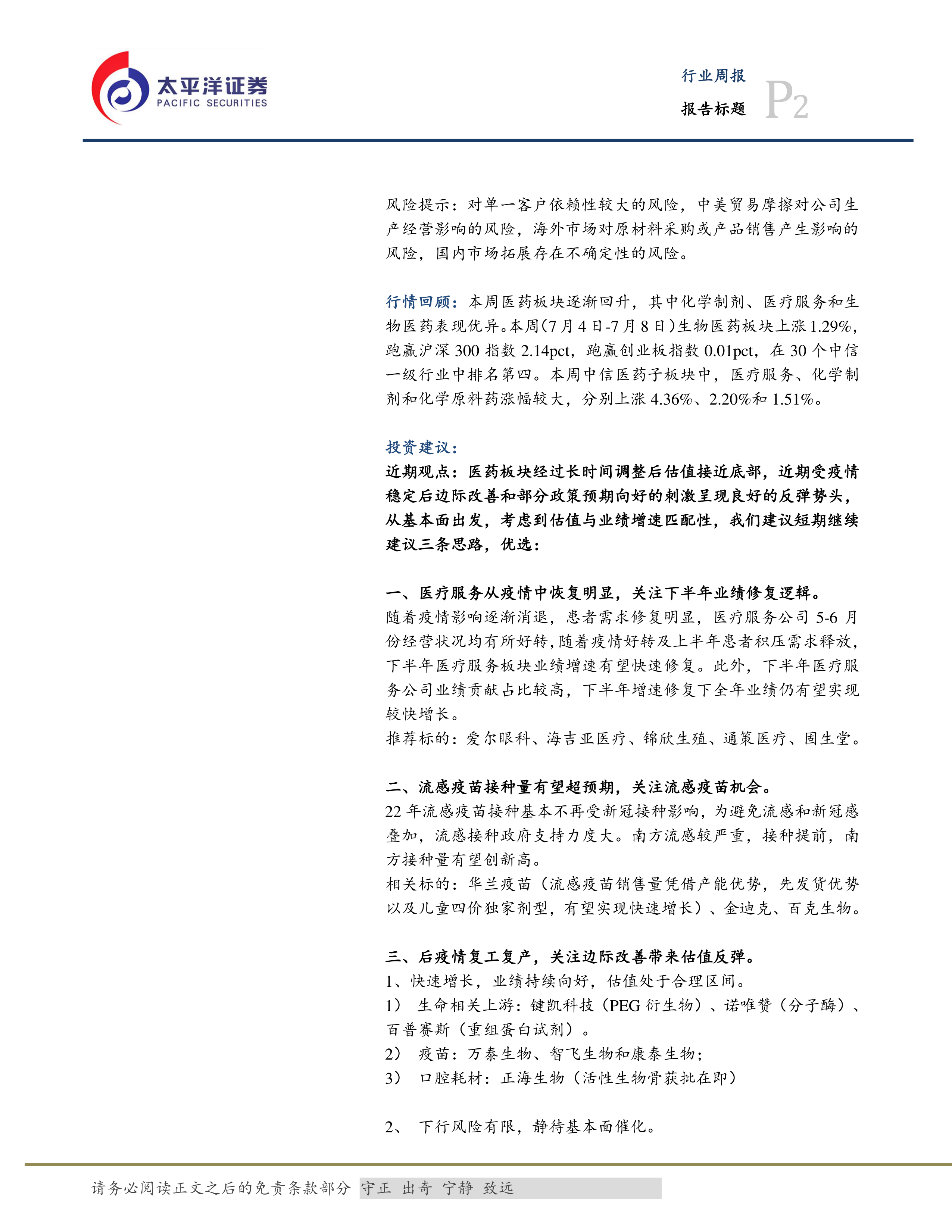 本报告的核心观点是:医药板块在经历长时间调整后,估值接近底部,近期呈现良好反弹势头。报告建议关注半年报业绩稳健、确定性高的标的,并从医疗服务、流感疫苗和后疫情复工复产三个方面提出了投资建议,同时分析了医药行业中长期发展趋势,并推荐了一系列具有投资价值的标的。