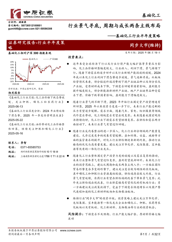 本报告对基础化工行业2025年上半年的运行情况进行了回顾,并对下半年的发展趋势进行了展望。报告指出,基础化工行业景气度已触底,并有望在供给侧改革和下游需求复苏的共同作用下实现边际回暖。投资策略建议关注两条主线:一是需求刚性、供给受限的农化板块(磷化工、钾肥、农药);二是政策扶持、下游需求快速增长的化工新材料和生物柴油板块。 报告还强调了行业龙头企业的重要性,并列出了潜在的风险因素。 总而言之,报告为投资者提供了对基础化工行业未来发展趋势的专业分析和投资建议。