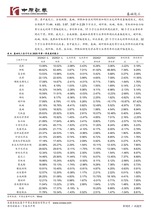 2024年以来,受宏观经济向好、下游需求回升以及新增产能投放放缓等因素影响,基础化工行业利润下滑态势逐步放缓,景气度逐渐触底。2025年一季度,尽管化学原料及化学制品制造业利润总额同比下滑,但收入增长,且行业毛利率和净利率环比均有所提升,显示行业盈利能力正在改善。