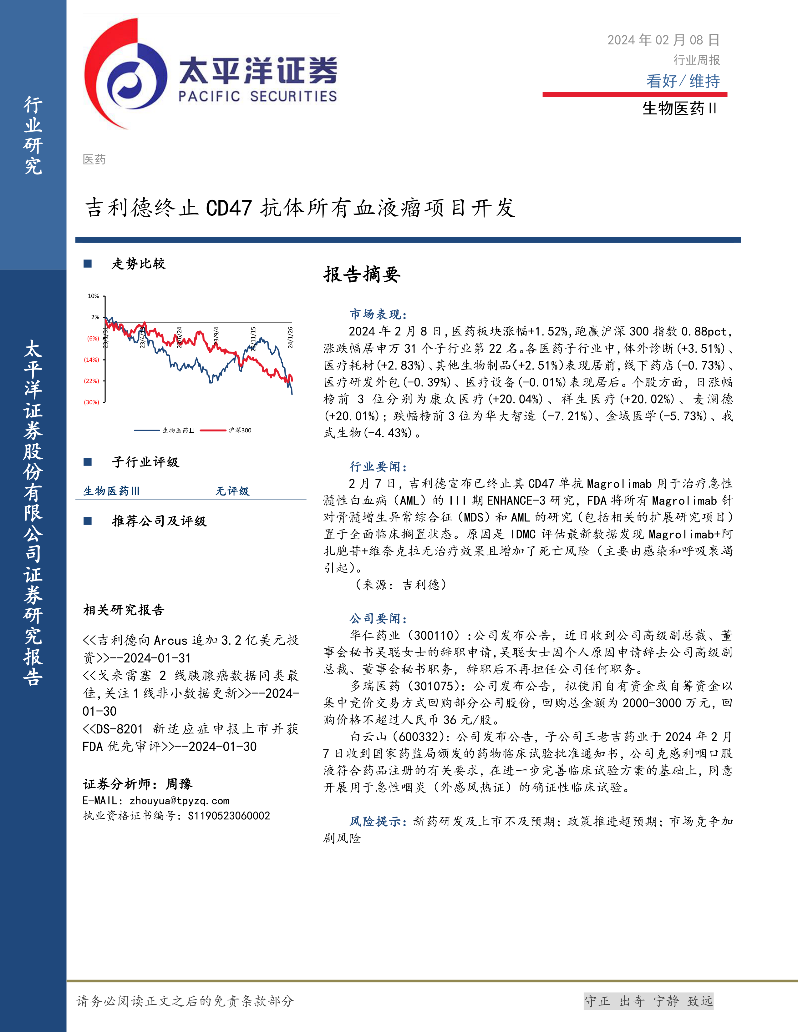 本报告的核心观点是:生物医药行业二级市场表现分化,部分细分领域表现强劲,但吉利德终止CD47抗体所有血液瘤项目开发对行业带来负面影响。 具体而言,报告分析了行业整体走势、子行业表现、个股涨跌情况以及行业重要新闻事件,并对未来走势进行了初步判断。