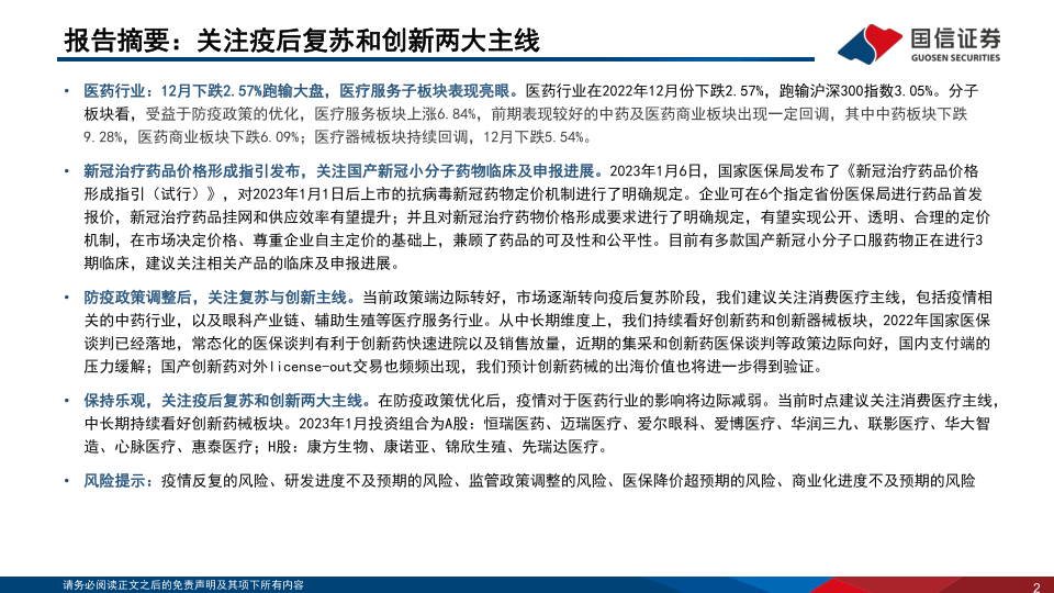 本报告的核心观点是:2023年医药生物行业投资策略应关注疫后复苏和创新两大主线。报告基于2022年12月医药行业数据、新冠疫情动态、国家政策变化以及行业发展趋势,建议关注消费医疗(如医疗服务、中药等)的复苏机会,并持续看好创新药械板块的长期发展潜力,尤其关注创新药出海和自主可控两大方向。报告同时提供了具体的投资组合建议,并提示了相应的风险。