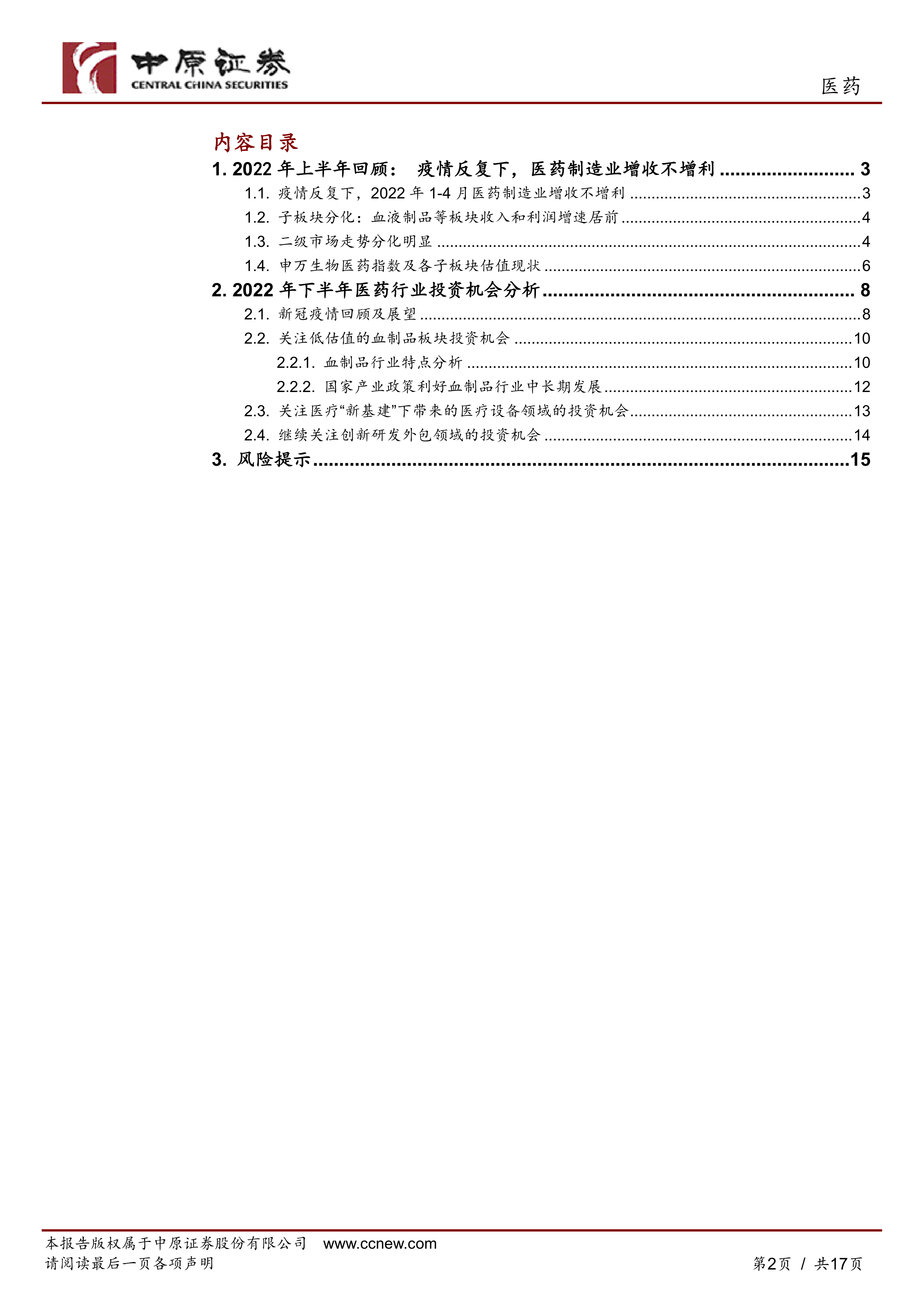 本报告基于对2022年上半年医药行业运行状况的分析,指出疫情反复导致医药制造业增收不增利,但子板块表现分化明显。下半年,建议关注低估值的血液制品板块、受益于医疗“新基建”的医疗设备板块以及创新研发外包板块的投资机会。 报告中提供的统计数据和图表清晰地展现了行业现状和未来发展趋势,为投资者提供了有价值的参考信息。 然而,报告也提示了疫情发展、中美关系、企业研发进程以及国家政策等方面的风险。 投资者应结合自身风险承受能力,谨慎决策。