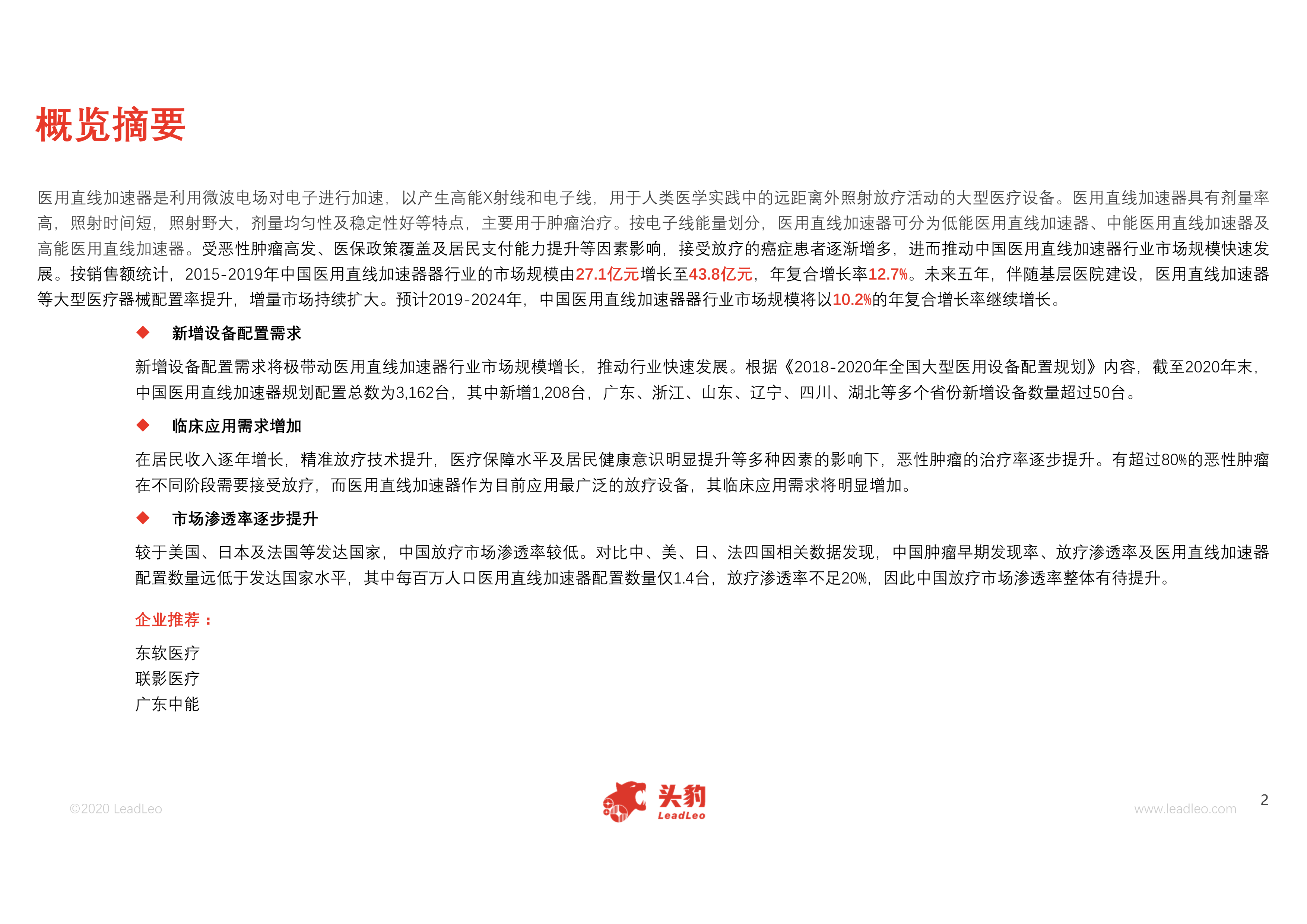 本报告基于头豹研究院2020年发布的《中国医用直线加速器行业概览》进行数据分析,核心观点如下: