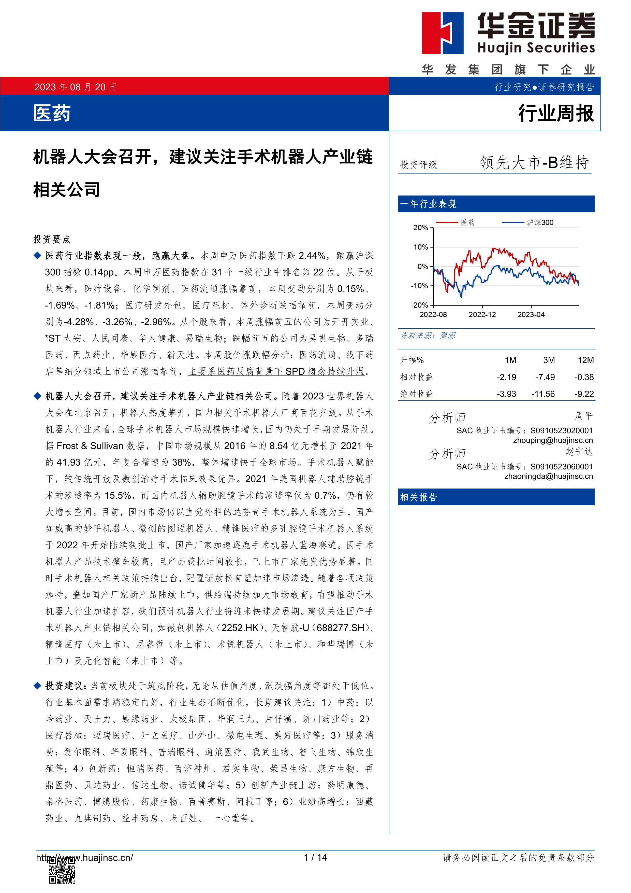 医药行业周报:机器人大会召开,建议关注手术机器人产业链相关公司