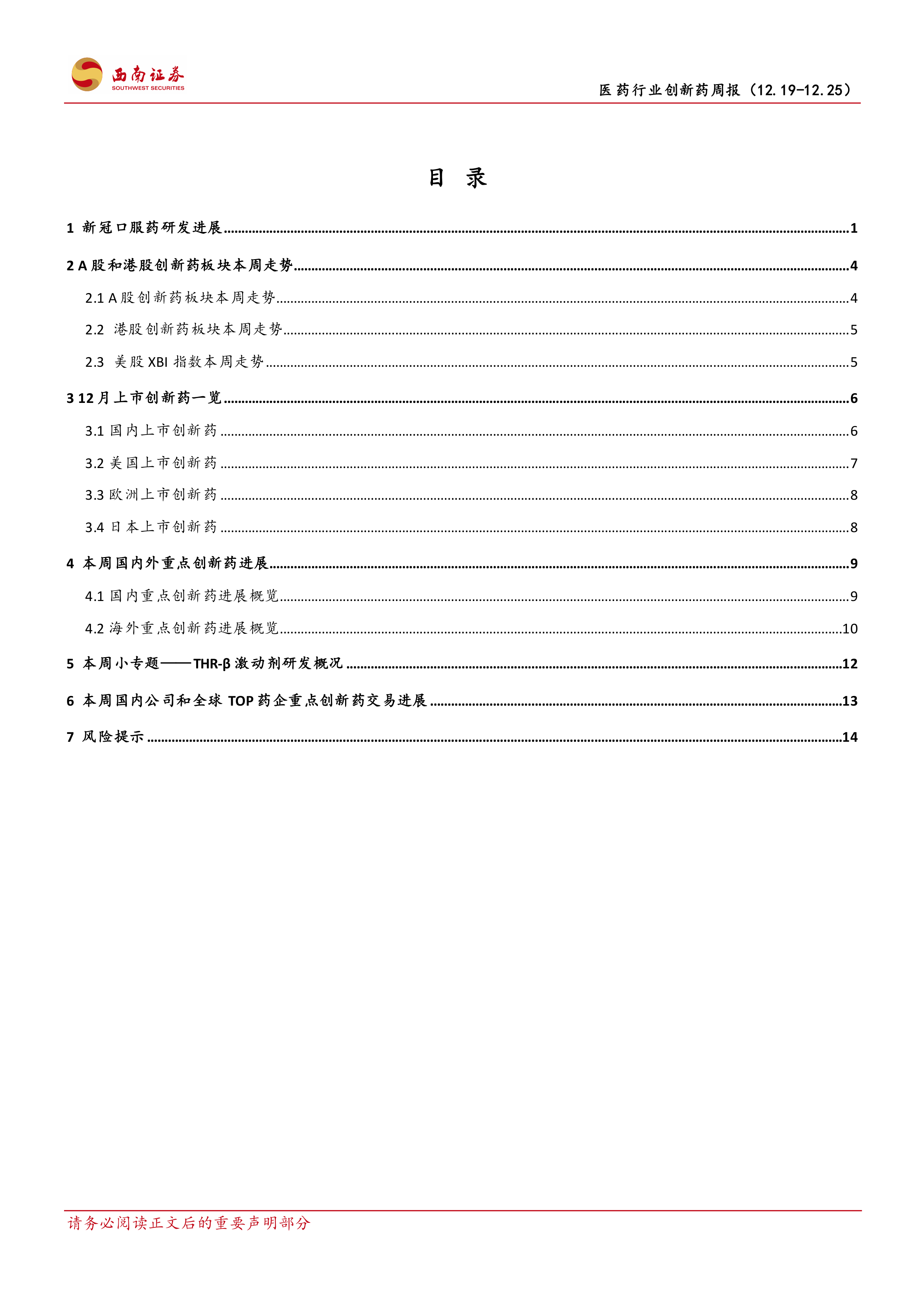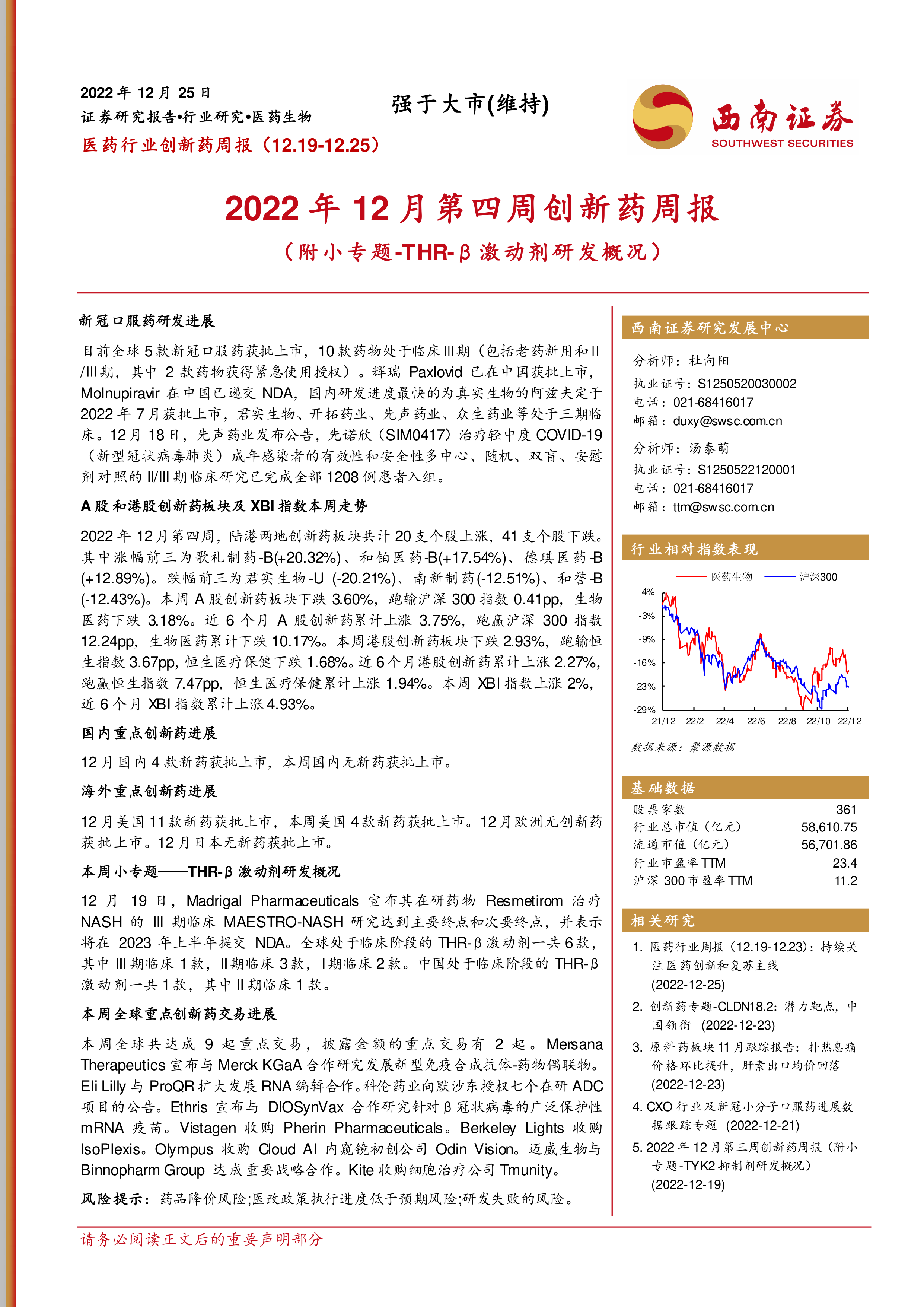 本报告的核心观点是:2022年12月19日至25日当周,医药行业创新药市场表现分化,A股和港股创新药板块整体下跌,但部分个股涨幅显著;新冠口服药研发持续推进,国内外均有进展;THR-β激动剂研发也取得进展,Resmetirom治疗NASH的III期临床试验达到主要终点。 市场表现与个股表现存在差异,需谨慎分析。