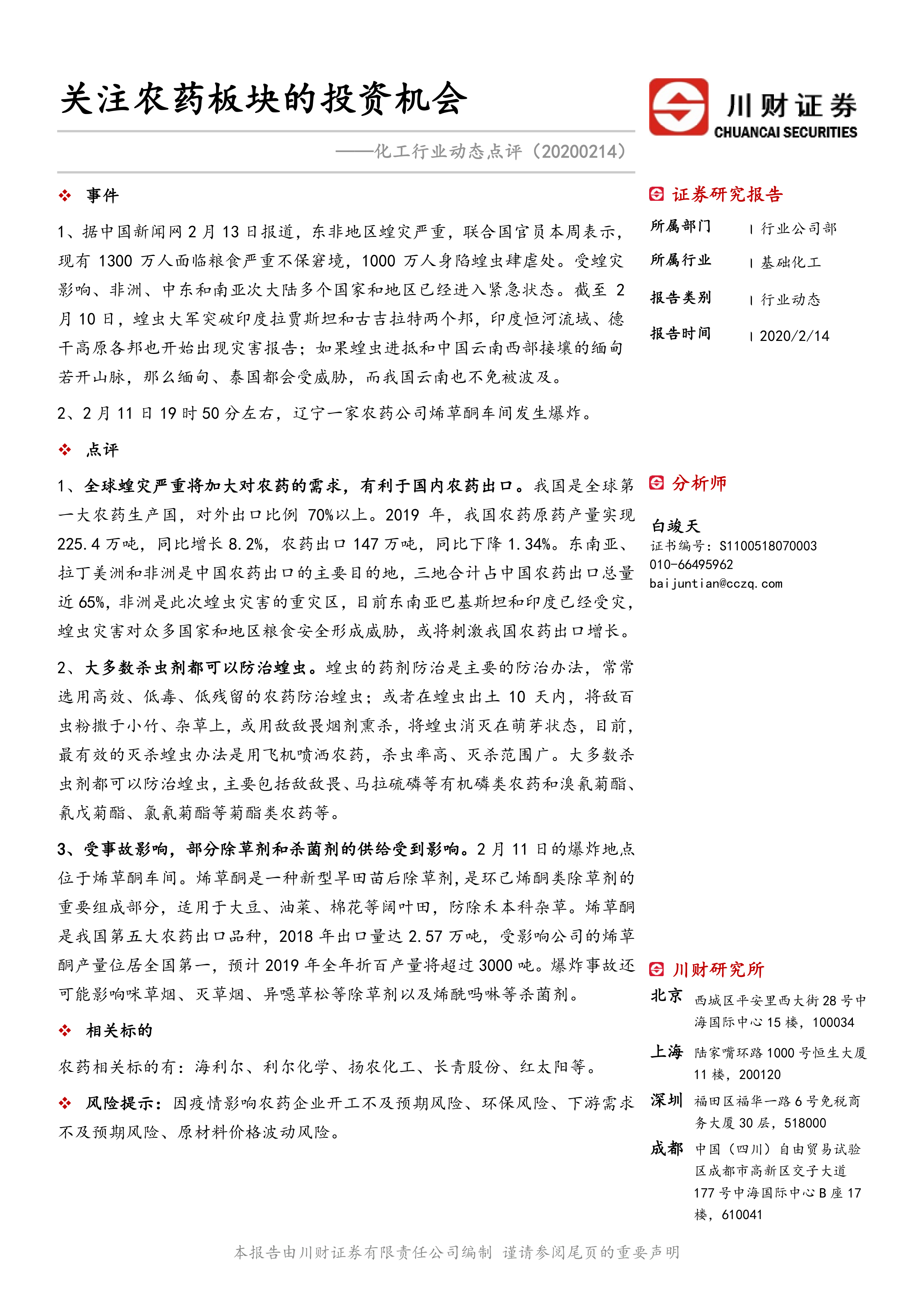 本报告主要从全球蝗灾和国内农药企业事故两个方面分析中国农药行业的投资机会。