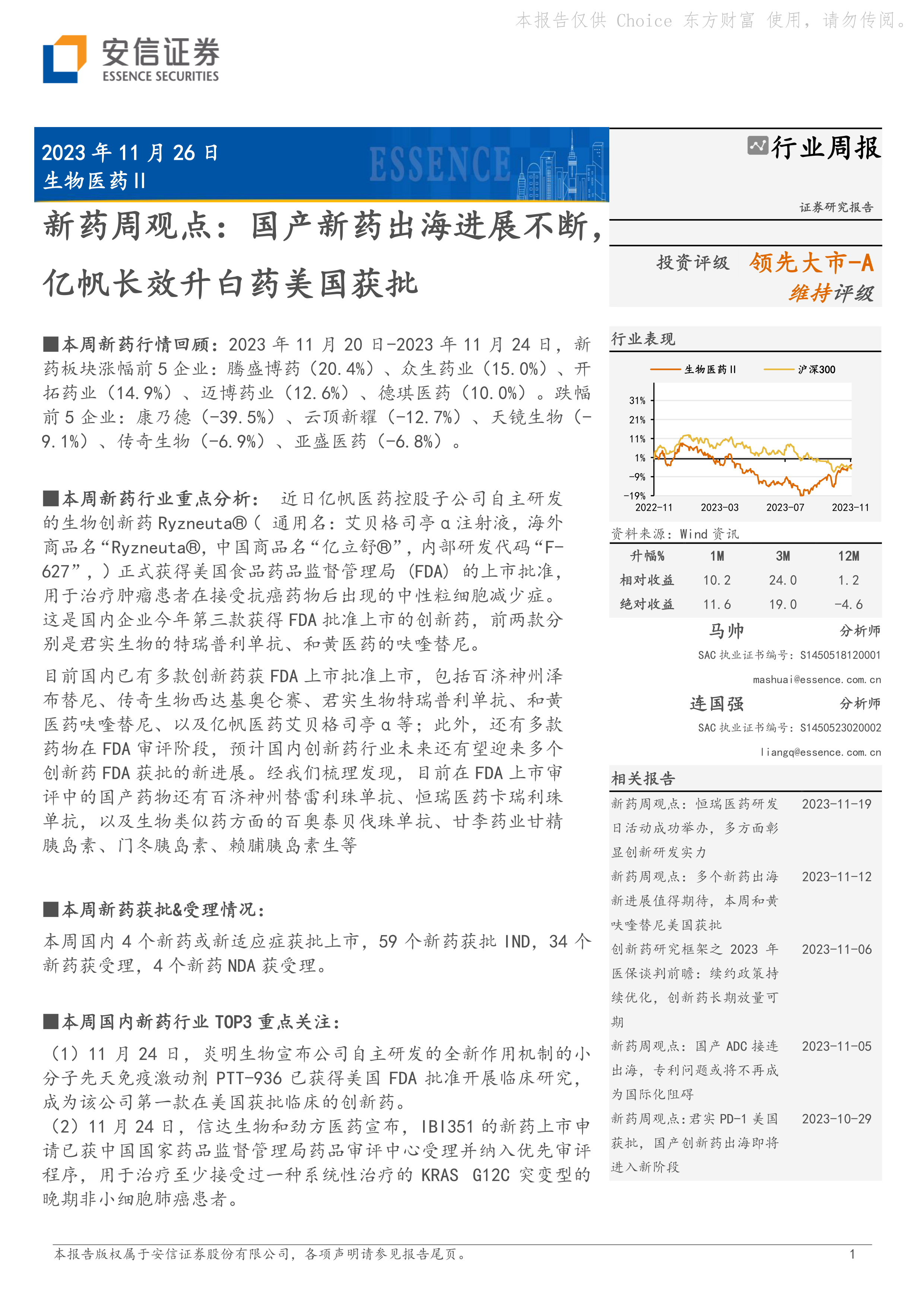 本周新药行情回顾: 2023 年 11 月 20 日-2023 年 11 月 24 日,新药板块涨幅前 5 企业:腾盛博药(20.4%)、众生药业(15.0%)、开拓药业(14.9%)、迈博药业(12.6%)、德琪医药(10.0%)。跌幅前 5 企业:康乃德(-39.5%)、云顶新耀(-12.7%)、天镜生物(-9.1%)、传奇生物(-6.9%)、亚盛医药(-6.8%)。