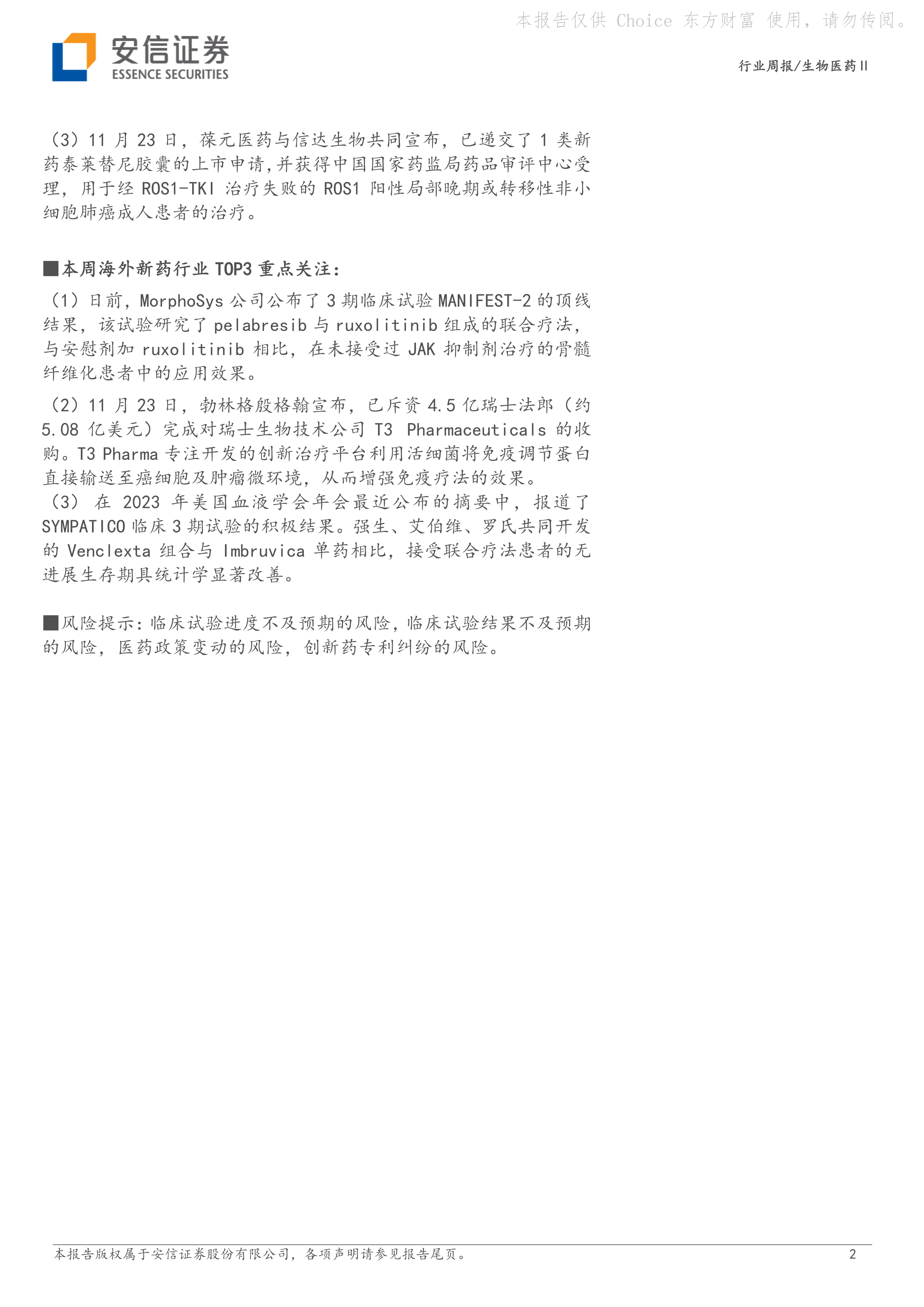 本部分关注了本周海外新药行业中值得关注的事件,例如MorphoSys公司pelabresib/ruxolitinib联合疗法的临床试验结果、勃林格殷格翰收购T3 Pharmaceuticals等。报告对这些事件进行了简要概述,并对部分重点事件进行了更详细的分析,例如MorphoSys公司pelabresib/ruxolitinib联合疗法临床试验结果的积极意义。