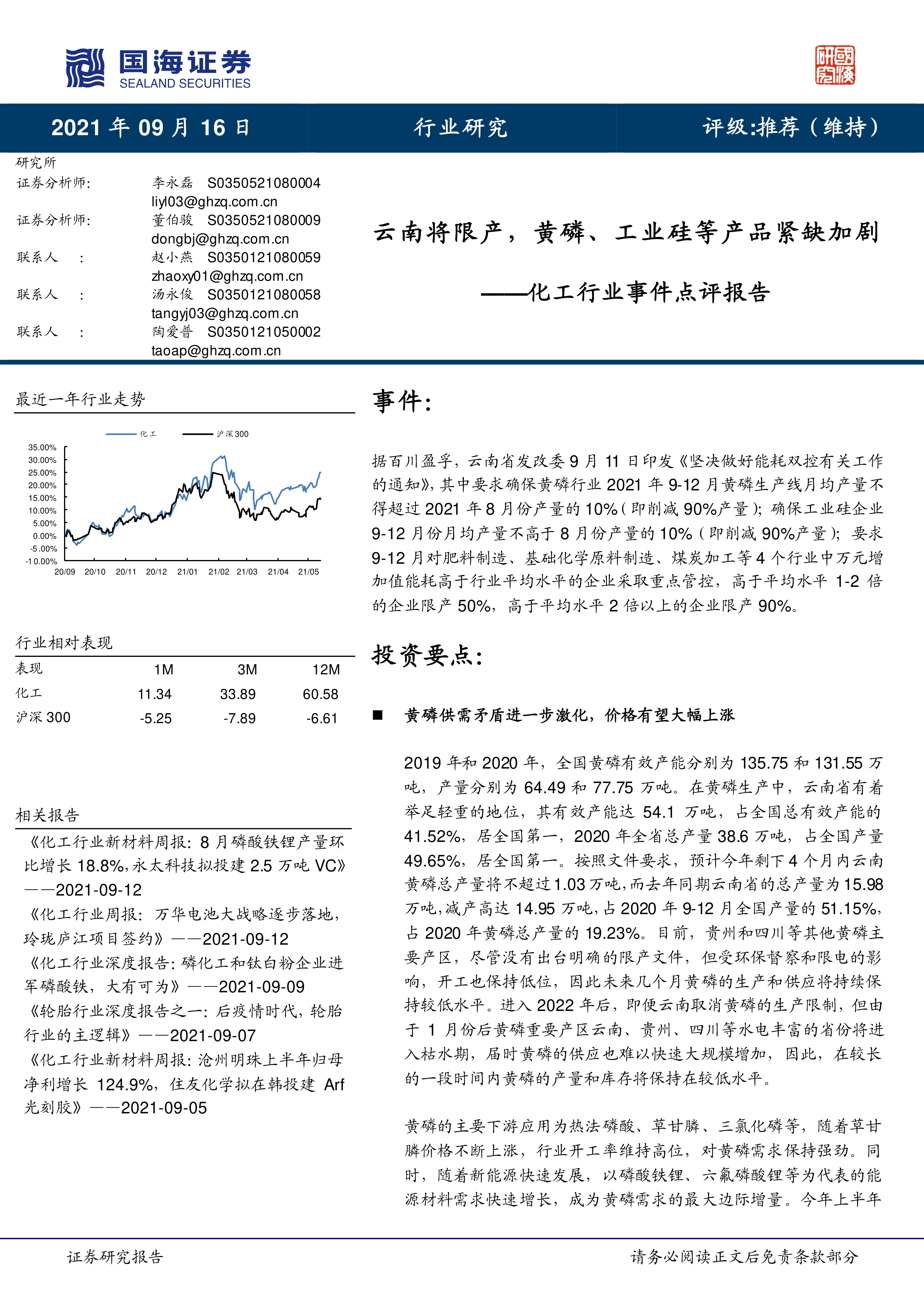 化工行业事件点评报告:云南将限产,黄磷、工业硅等产品紧缺加剧