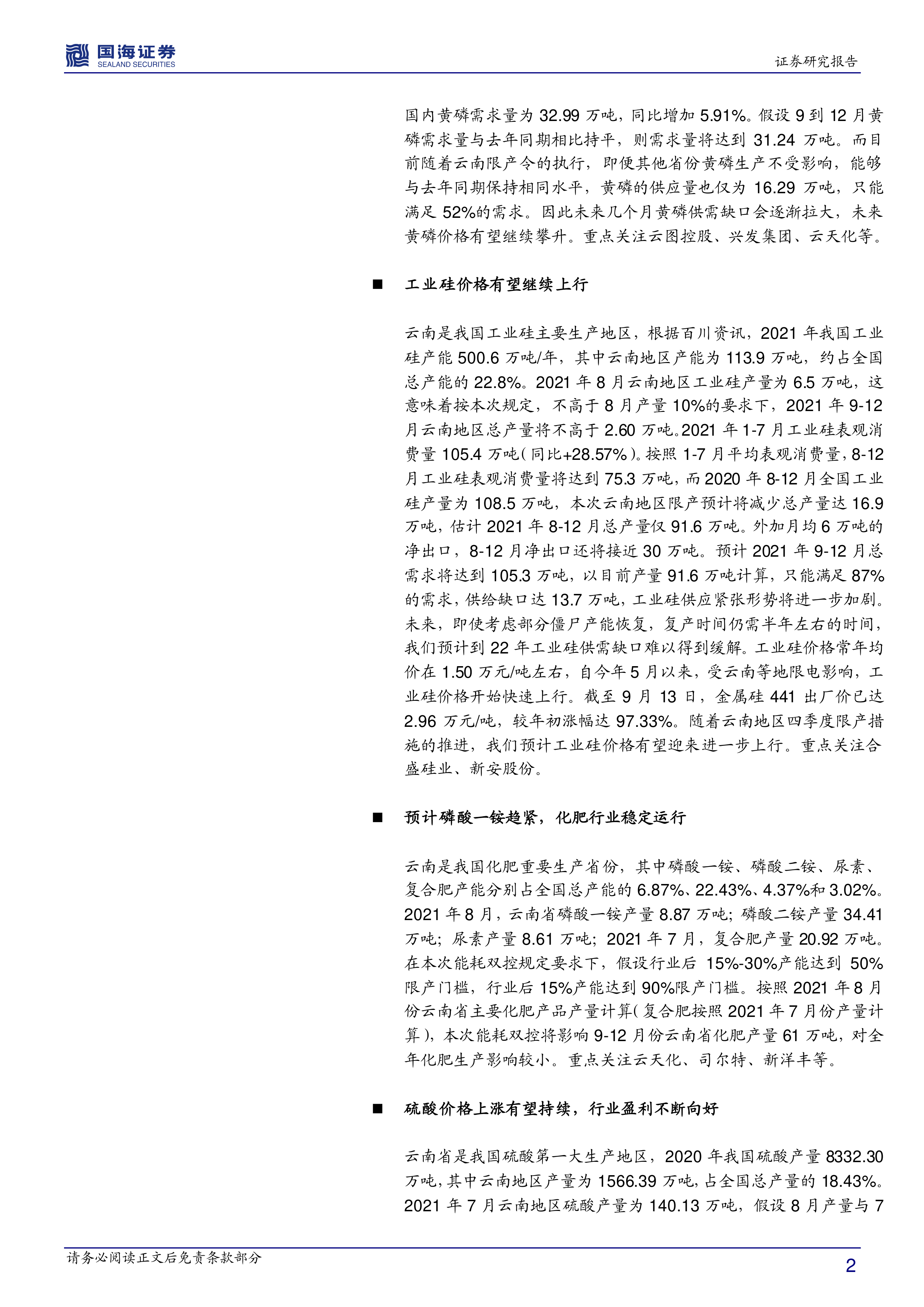 行业评级及投资策略云南是我国黄磷、工业硅、化肥和硫酸重要生产省份,按照云南发改委本次文件要求,相关产品供给将受到影响,供需将进一步趋紧,产品价格有望持续上行,因此给予行业“推荐”评级。