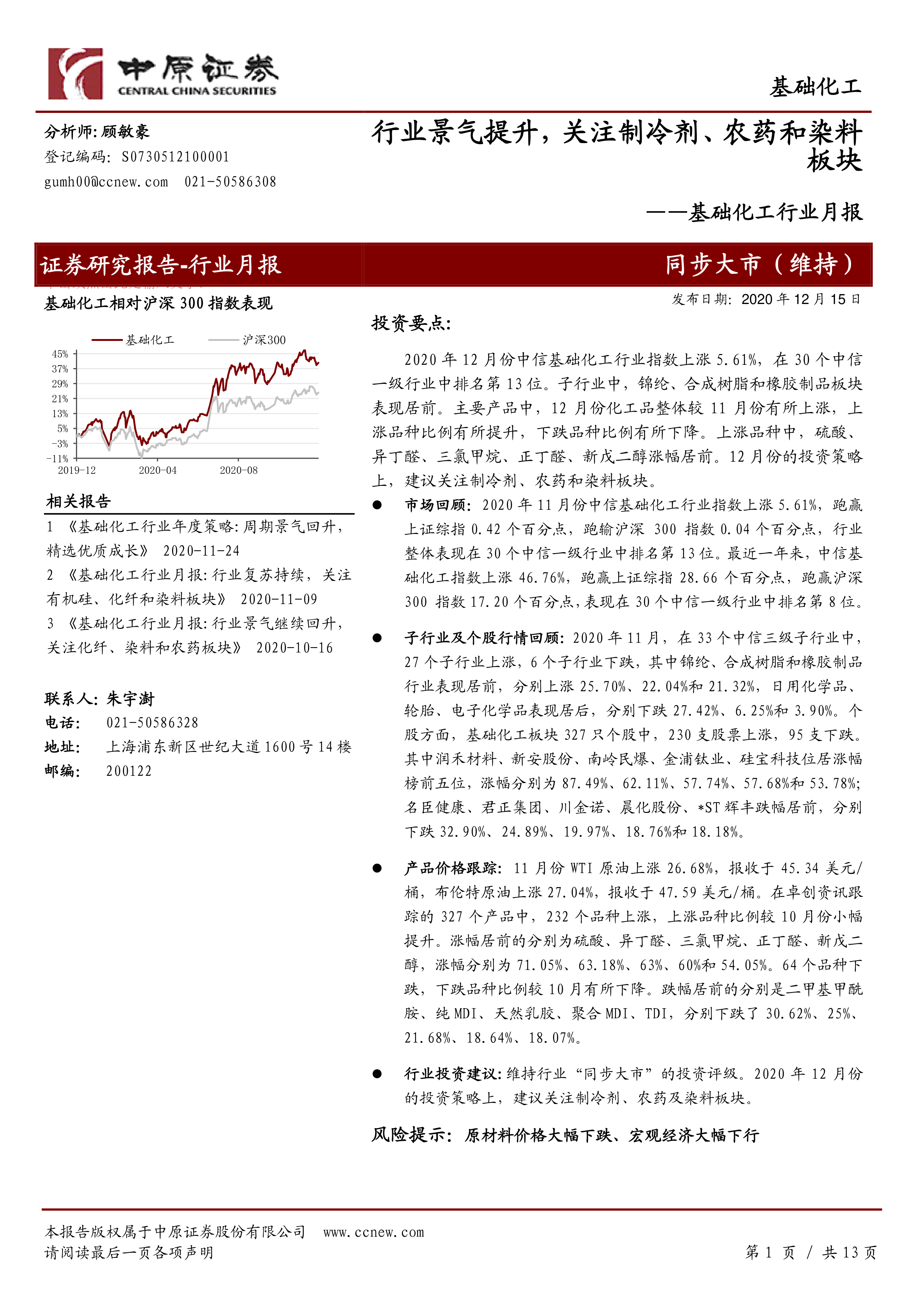 行业投资建议:维持行业“同步大市”的投资评级。2020 年 12 月份的投资策略上,建议关注制冷剂、农药及染料板块。