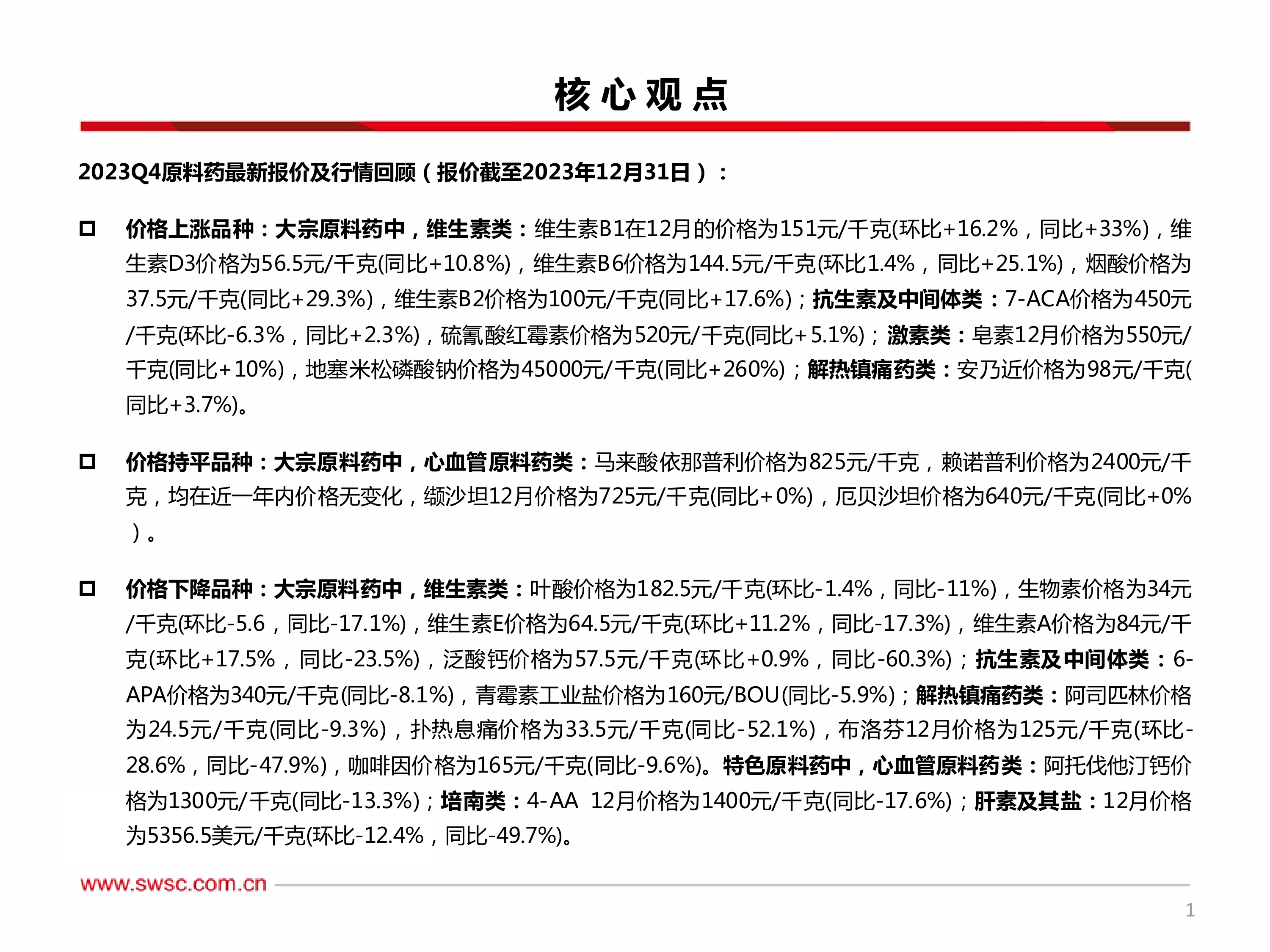 报告首先回顾了2023年12月原料药的最新报价及行情,将原料药分为维生素类、抗生素及中间体类、激素类、解热镇痛药类以及特色原料药(心血管原料药类、培南类、肝素及其盐)等几大类,并分别分析了各类别中价格上涨、持平及下降的品种,以及价格变动的原因。