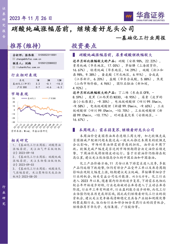 本报告对2023年11月26日基础化工行业周报进行了数据分析和解读。报告指出,基础化工行业呈现需求弱复苏态势,部分产品价格波动显著,硝酸和纯碱价格涨幅居前,尿素和碳酸锂价格跌幅较大。报告建议投资者关注行业龙头公司以及纯碱、草铵膦等细分行业的机会,同时需警惕下游需求不及预期、原料价格波动、环保政策变化以及个股业绩不及预期等风险。 报告提供了详细的行业跟踪分析、个股动态、投资组合建议以及价格波动原因分析,为投资者提供了较为全面的市场信息和投资参考。