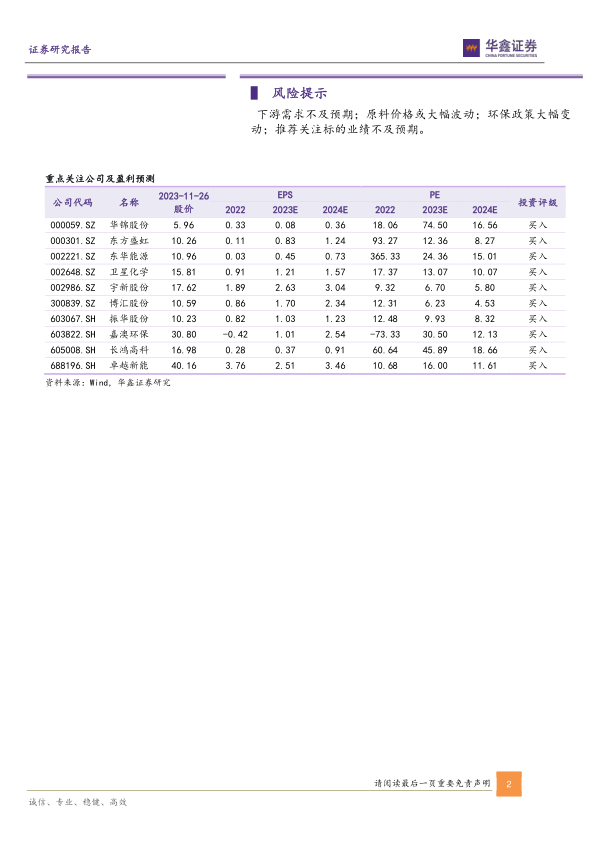 下游需求不及预期;原料价格或大幅波动;环保政策大幅变动;推荐关注标的业绩不及预期。