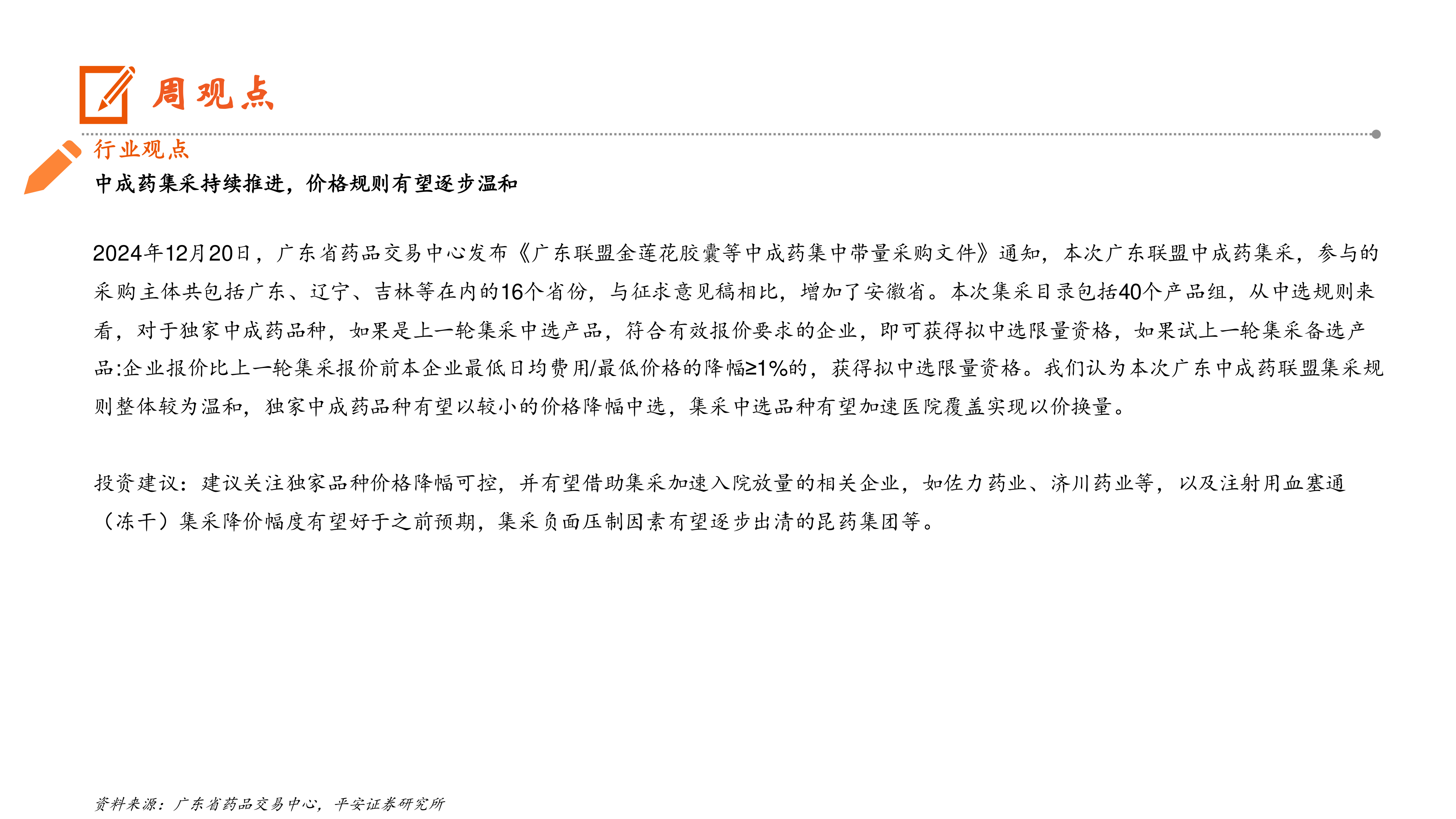 2024年12月20日,广东省药品交易中心发布《广东联盟金莲花胶囊等中成药集中带量采购文件》通知,本次广东联盟中成药集采,参与的采购主体共包括广东、辽宁、吉林等在内的16个省份,与征求意见稿相比,增加了安徽省。本次集采目录包括40个产品组,从中选规则来看,对于独家中成药品种,如果是上一轮集采中选产品,符合有效报价要求的企业,即可获得拟中选限量资格,如果试上一轮集采备选产品:企业报价比上一轮集采报价前本企业最低日均费用/最低价格的降幅≥1%的,获得拟中选限量资格。我们认为本次广东中成药联盟集采规则整体较为温和,独家中成药品种有望以较小的价格降幅中选,集采中选品种有望加速医院覆盖实现以价换量。