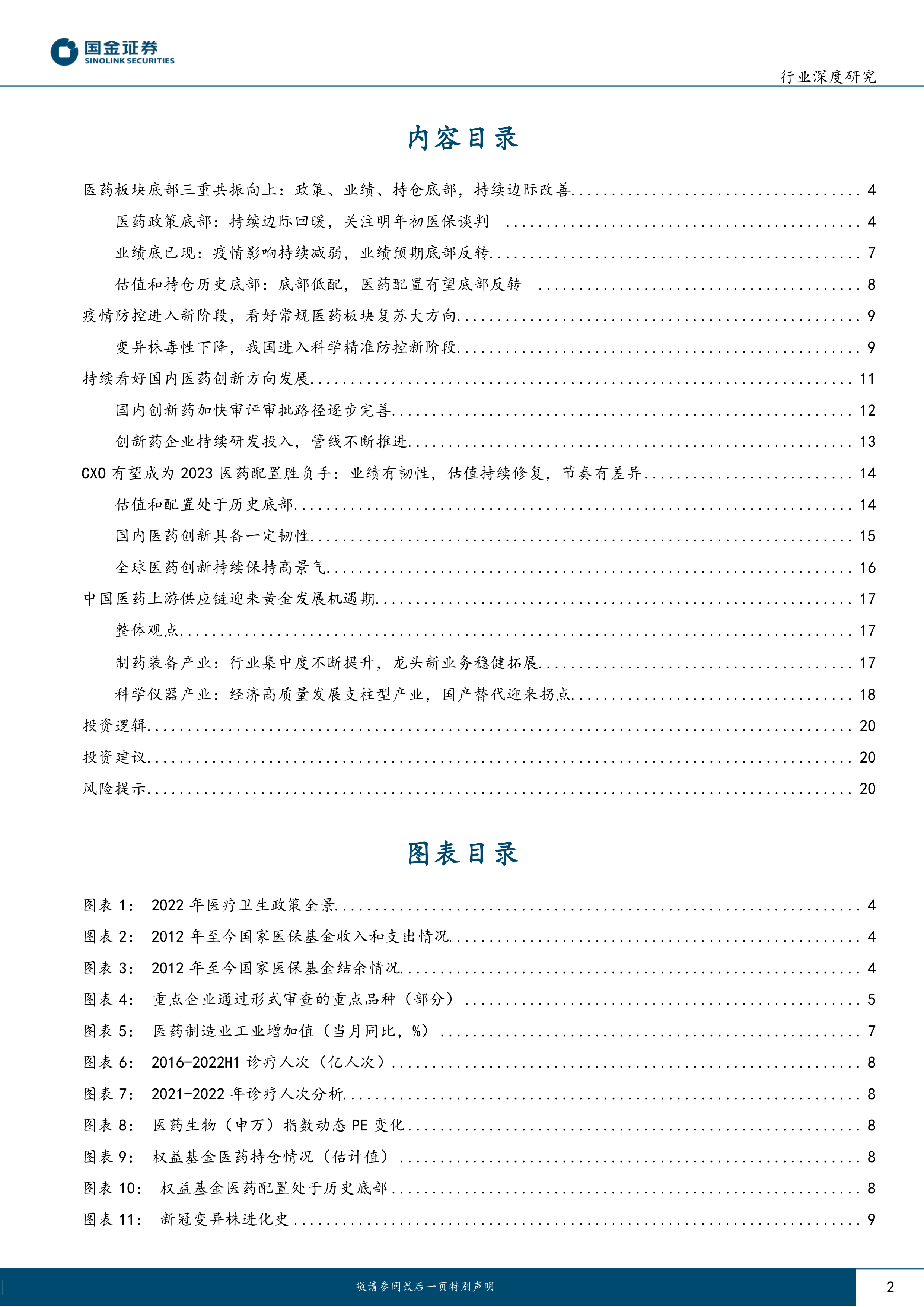 本报告分析了医药板块的市场现状及未来发展趋势,认为医药板块正处于底部反转的关键时期,政策、业绩、估值等多重因素共同推动板块向上。报告建议关注常规医药修复和医药创新双主线,重点关注具备商业化推广能力的创新Pharma龙头、具备业绩兑现能力的转型药企、具备创新催化的Biotech企业和中医药龙头企业,以及CXO板块龙头企业和医药上游供应链中的国产替代机遇。 报告也指出了新冠疫情发展变化、创新药研发、产品产能、政策监管、医保谈判等方面的风险。 投资者需谨慎评估风险,并结合自身情况进行投资决策。