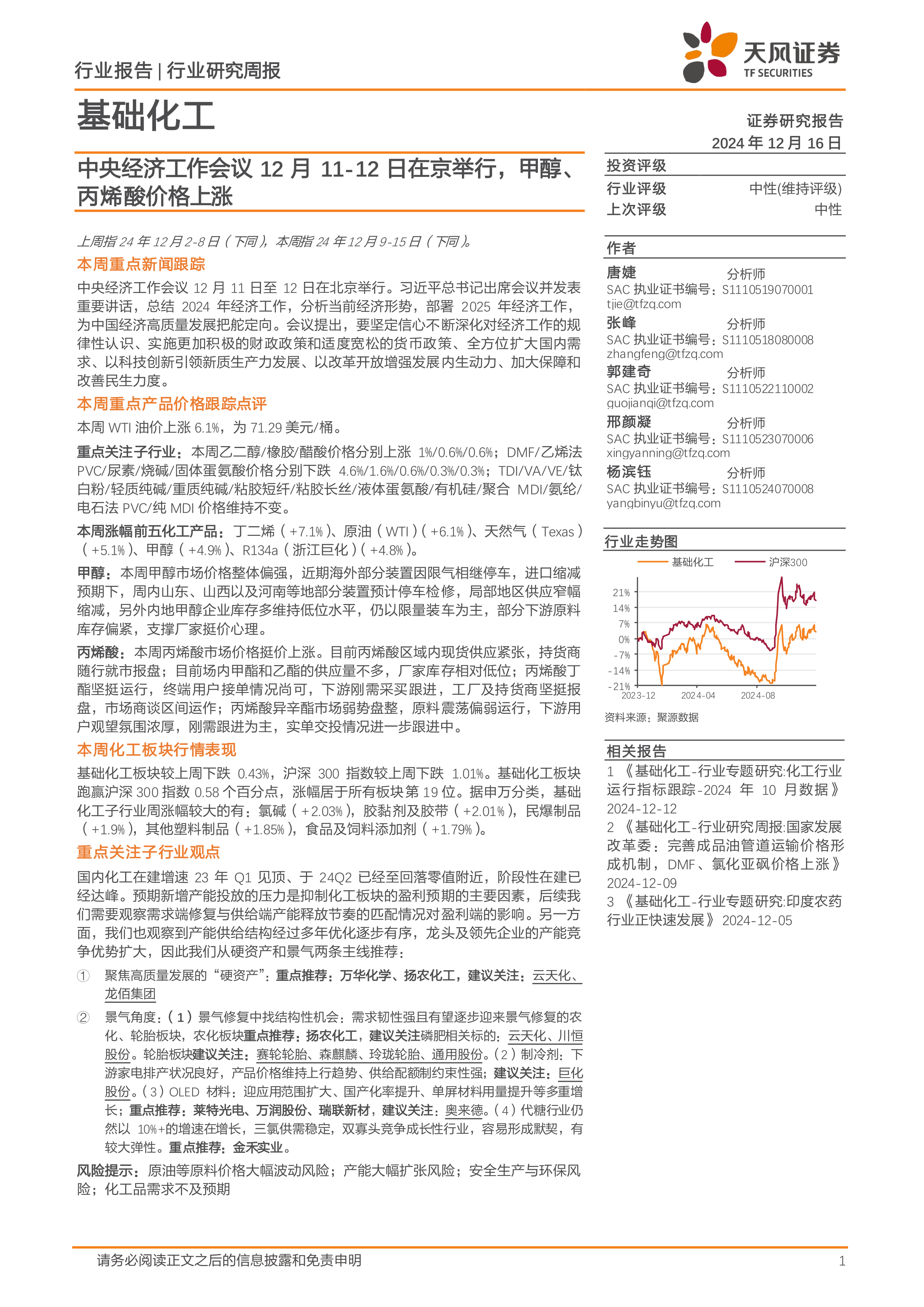 基础化工行业研究周报:中央经济工作会议12月11-12日在京举行,甲醇、丙烯酸价格上涨