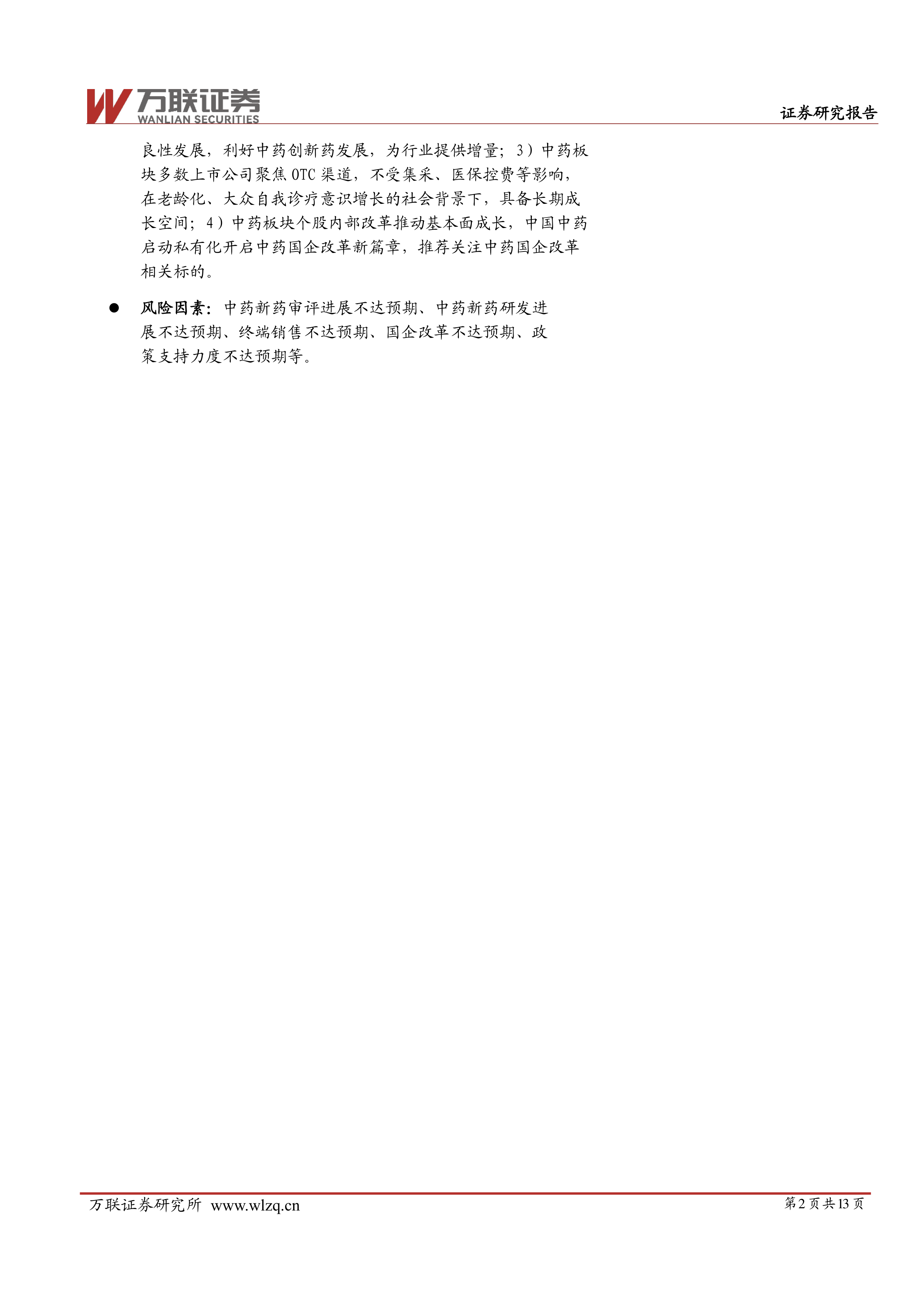 报告最后给出了投资建议和风险提示。长期看好中药板块,但需关注中药新药审评进展、研发进展、终端销售、国企改革以及政策支持力度等风险因素。