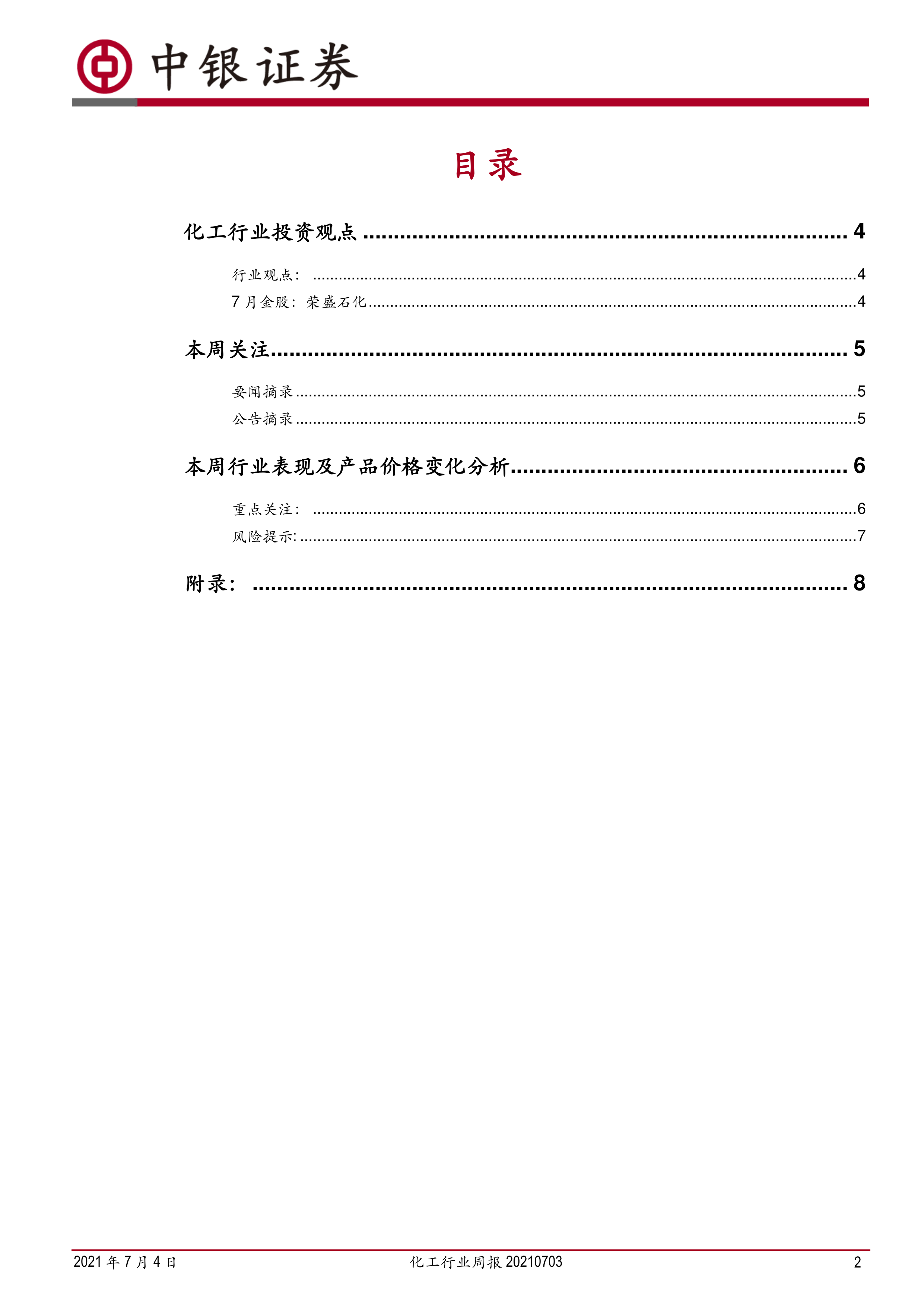 本报告分析了2021年6月及7月初化工行业市场表现。国际原油价格持续上涨是影响化工品价格的重要因素,部分化工产品价格波动加剧。周期性公司估值处于合理区间,二季度业绩有望提升。半导体新材料等子行业受到市场关注。报告建议投资者关注化肥、农药、化纤、维生素、新材料等子行业龙头企业,并推荐了具体的投资标的。 报告同时提示了地缘政治因素和全球疫情形势变化可能带来的风险。