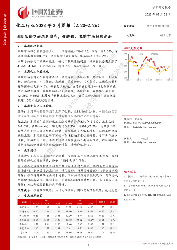 化工行业2023年2月周报:国际油价空好消息博弈,碳酸锂、农药市场持续走弱
