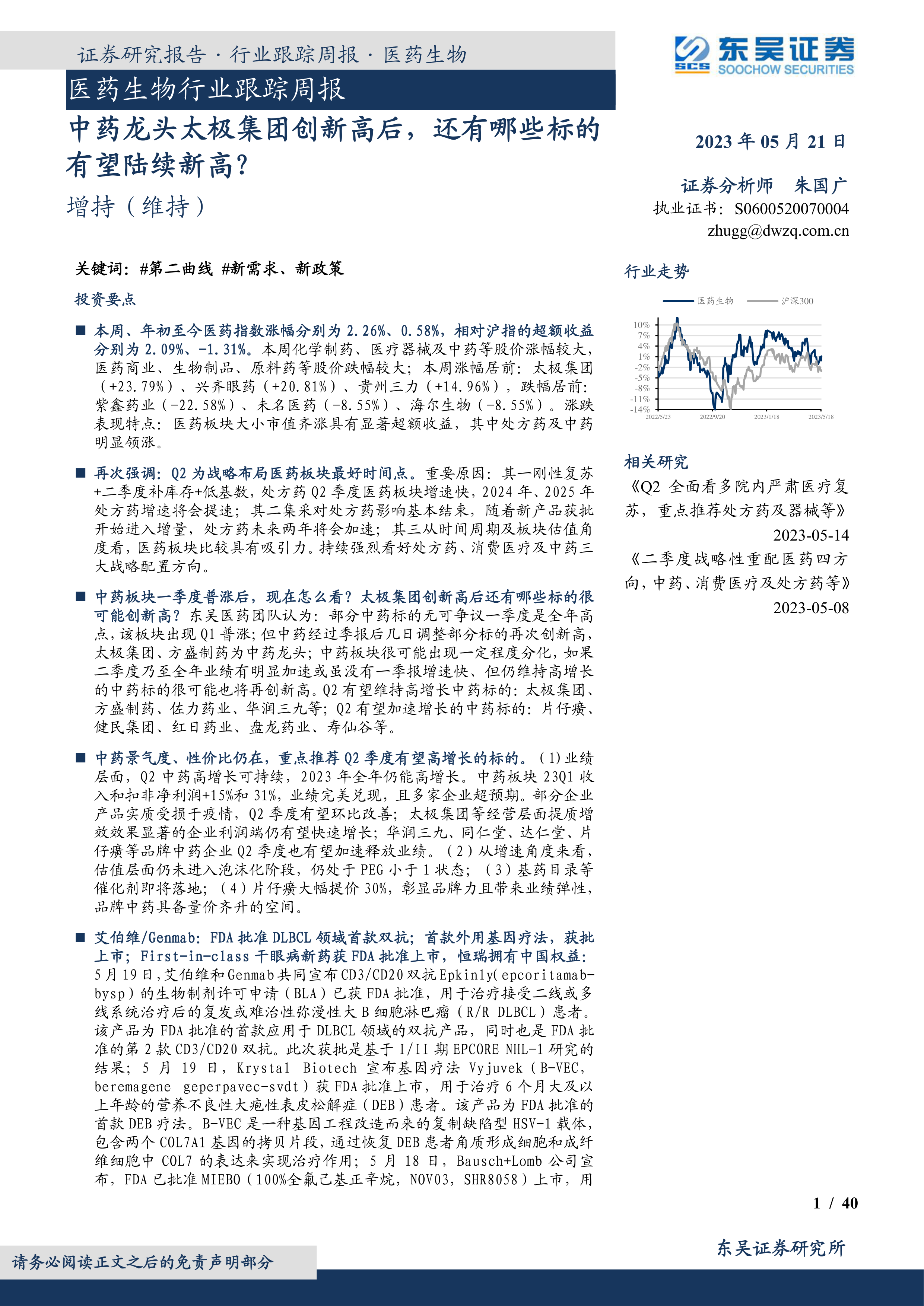 中药板块一季度普涨后,现在怎么看?太极集团创新高后还有哪些标的很可能创新高?东吴医药团队认为:部分中药标的无可争议一季度是全年高点,该板块出现Q1普涨;但中药经过季报后几日调整部分标的再次创新高,太极集团、方盛制药为中药龙头;中药板块很可能出现一定程度分化,如果二季度乃至全年业绩有明显加速或虽没有一季报增速快、但仍维持高增长的中药标的很可能也将再创新高。Q2有望维持高增长中药标的:太极集团、方盛制药、佐力药业、华润三九等;Q2有望加速增长的中药标的:片仔癀、健民集团、红日药业、盘龙药业、寿仙谷等。