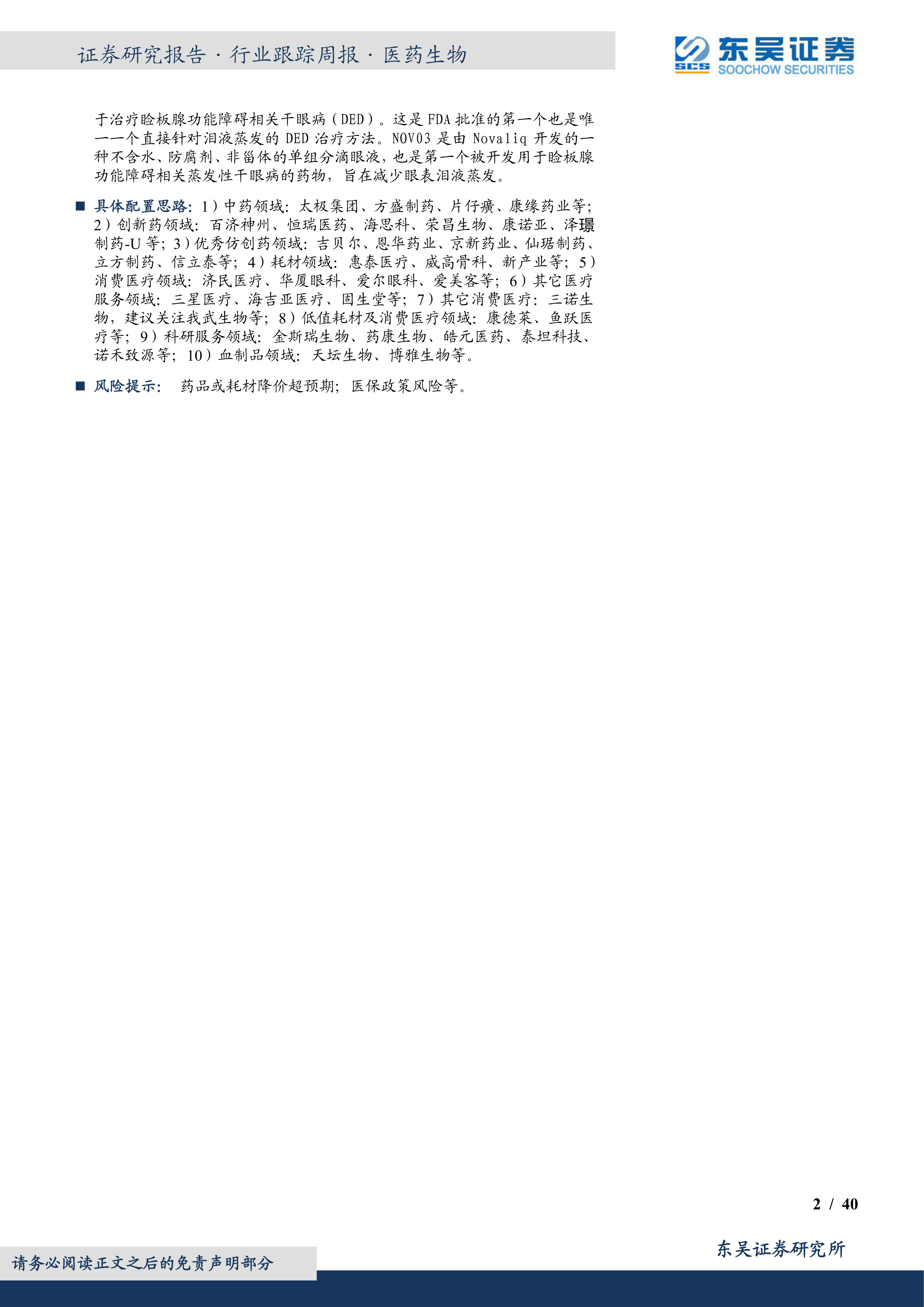 具体配置思路:1)中药领域:太极集团、方盛制药、片仔癀、康缘药业等;2)创新药领域:百济神州、恒瑞医药、海思科、荣昌生物、康诺亚、泽璟制药-U等;3)优秀仿创药领域:吉贝尔、恩华药业、京新药业、仙琚制药、立方制药、信立泰等;4)耗材领域:惠泰医疗、威高骨科、新产业等;5)消费医疗领域:济民医疗、华厦眼科、爱尔眼科、爱美客等;6)其它医疗服务领域:三星医疗、海吉亚医疗、固生堂等;7)其它消费医疗:三诺生物,建议关注我武生物等;8)低值耗材及消费医疗领域:康德莱、鱼跃医疗等;9)科研服务领域:金斯瑞生物、药康生物、皓元医药、泰坦科技、诺禾致源等;10)血制品领域:天坛生物、博雅生物等。