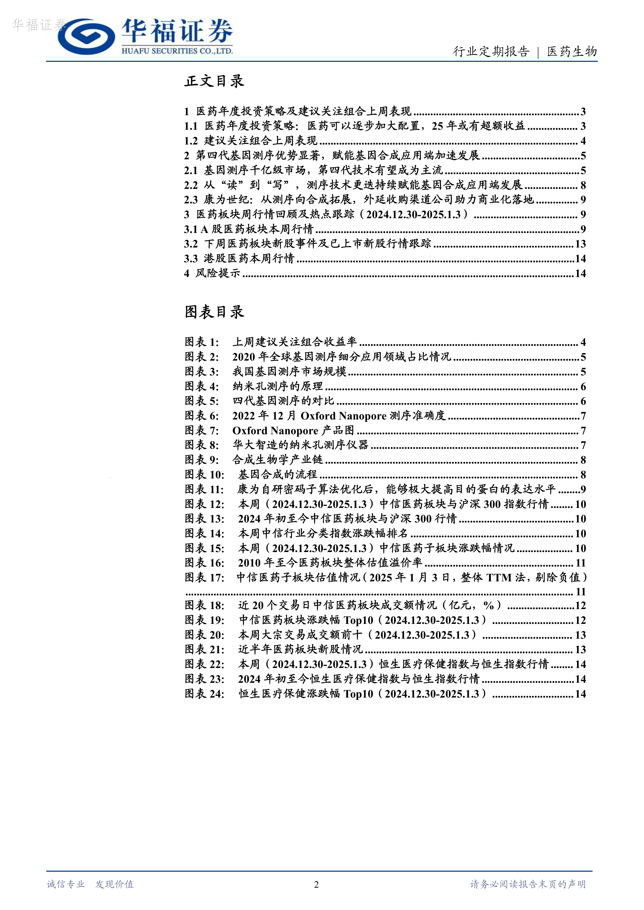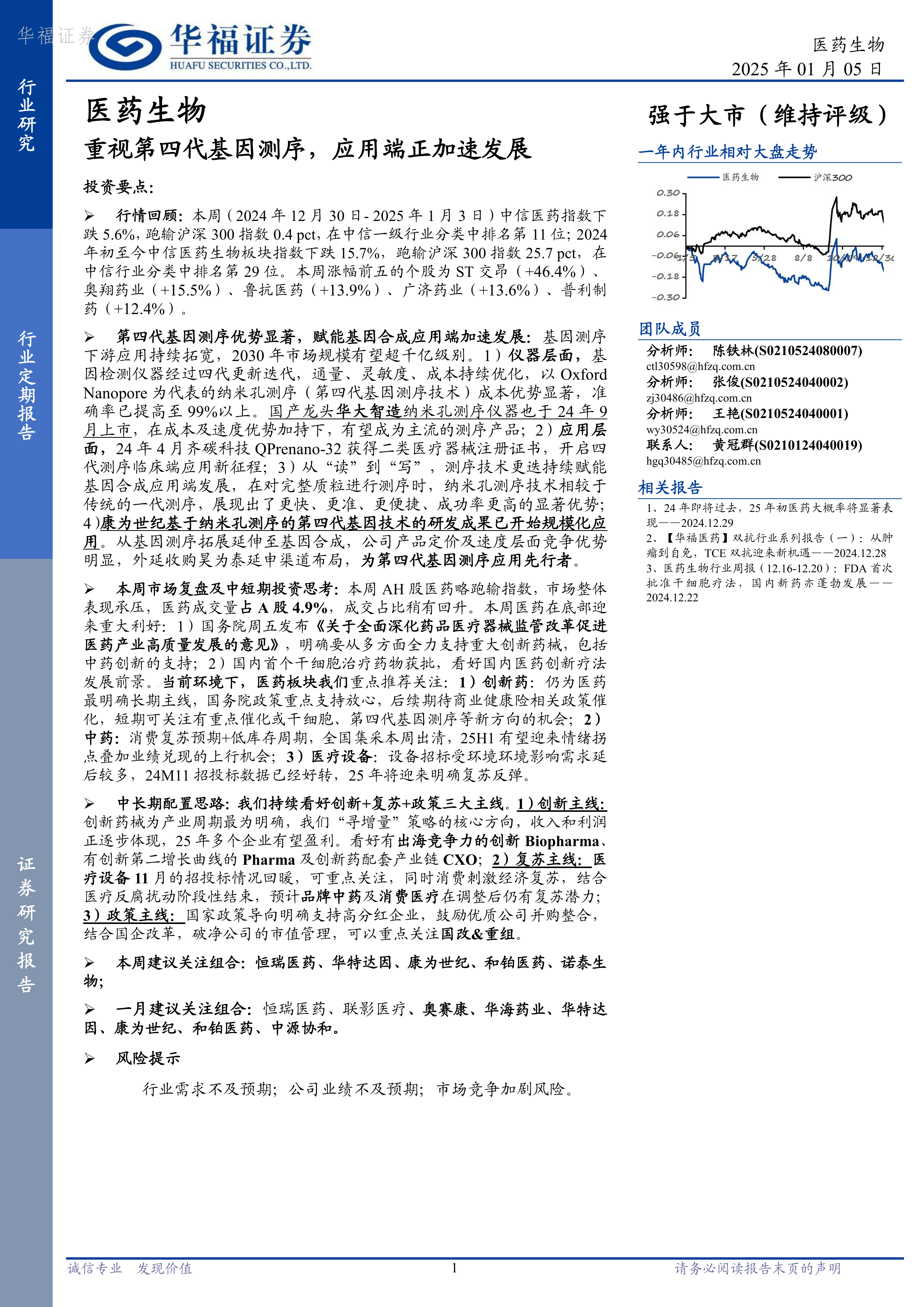 本报告深入分析了第四代基因测序技术的优势及其在基因合成领域的应用前景,并对医药板块的近期市场表现进行了全面的回顾和总结。报告基于创新、复苏、政策三大主线,提出了清晰的中长期投资策略,并推荐了相应的关注组合,为投资者提供了有价值的参考信息。 然而,报告也指出了行业需求不及预期、公司业绩不及预期以及市场竞争加剧等风险因素,投资者需谨慎决策,自担投资风险。 报告中对康为世纪等公司的分析,突显了其在第四代基因测序技术应用领域的领先地位和发展潜力。 对医药板块整体的分析,则为投资者提供了在当前市场环境下进行投资决策的参考框架。