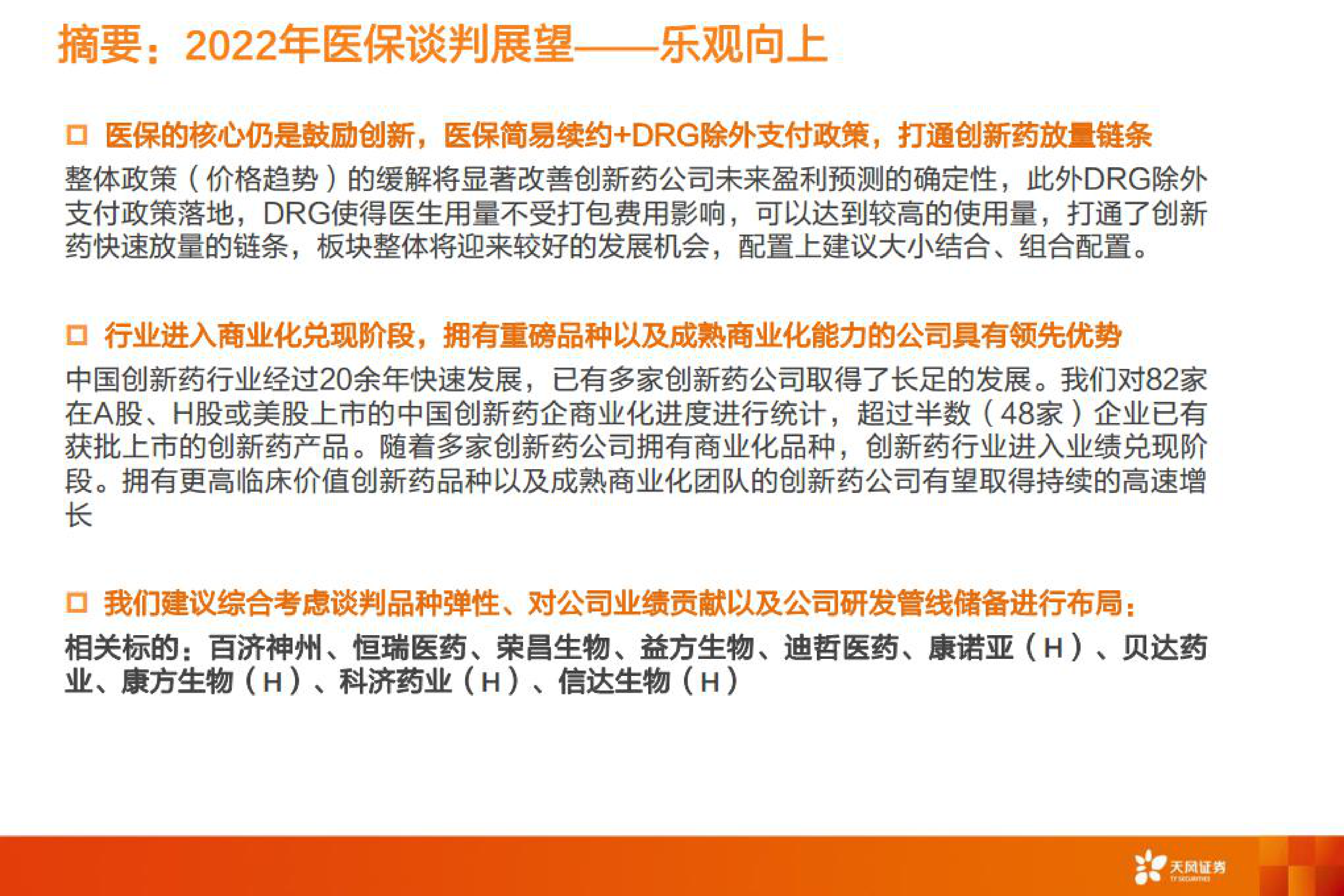 整体政策(价格超势)的缓解将显著改善创新药公司未来盈利预测的确定性,此外DRG除外支付政策落地,DRG使得医生用量不受打包费用影响,可以达到较高的使用量,打通了创新药快速放量的链条,板块整体将迎来较好的发展机会,配置上建议大小结合、组合配置。