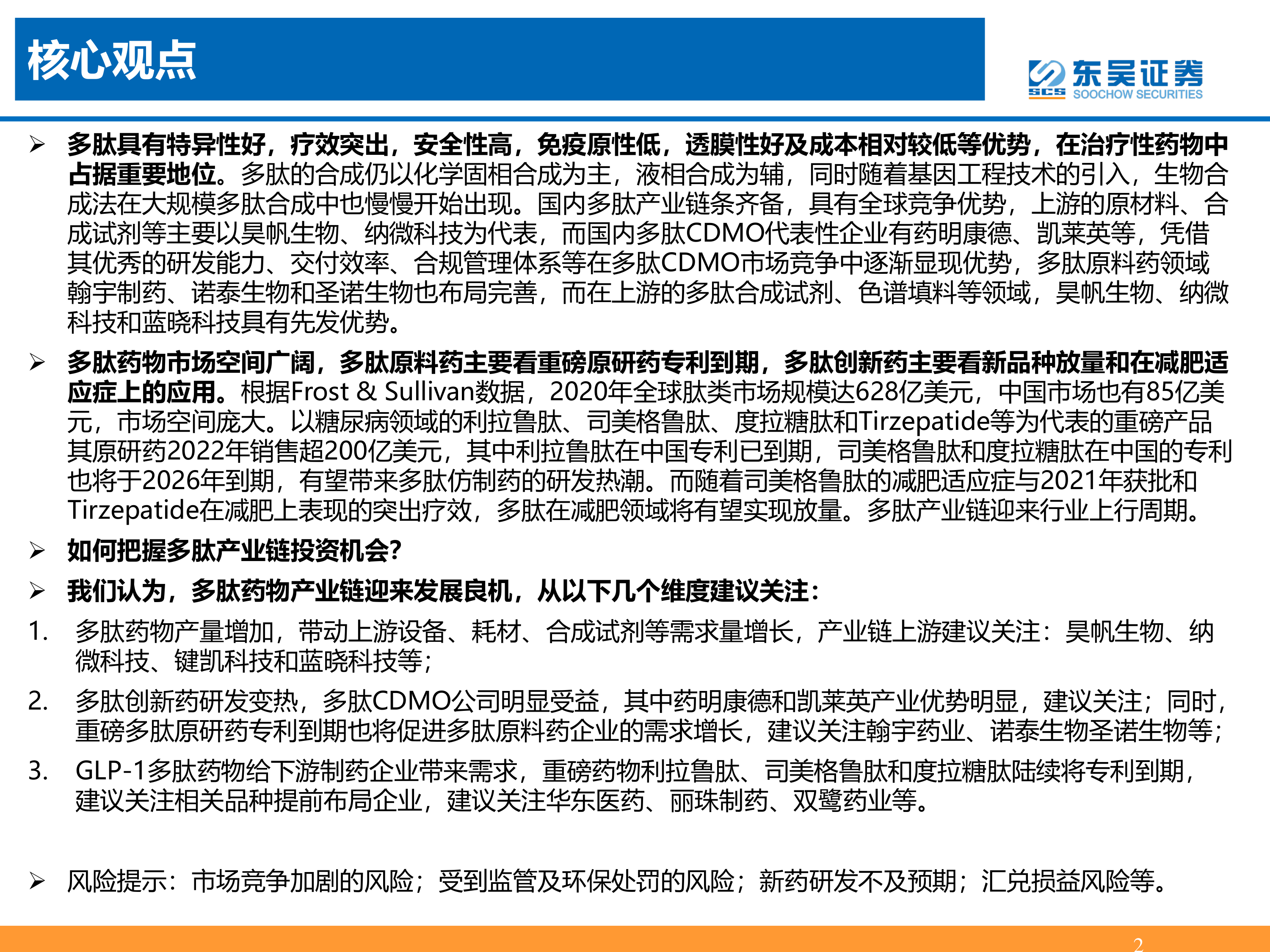 我们认为,多肽药物产业链迎来发展良机,从以下几个维度建议关注: