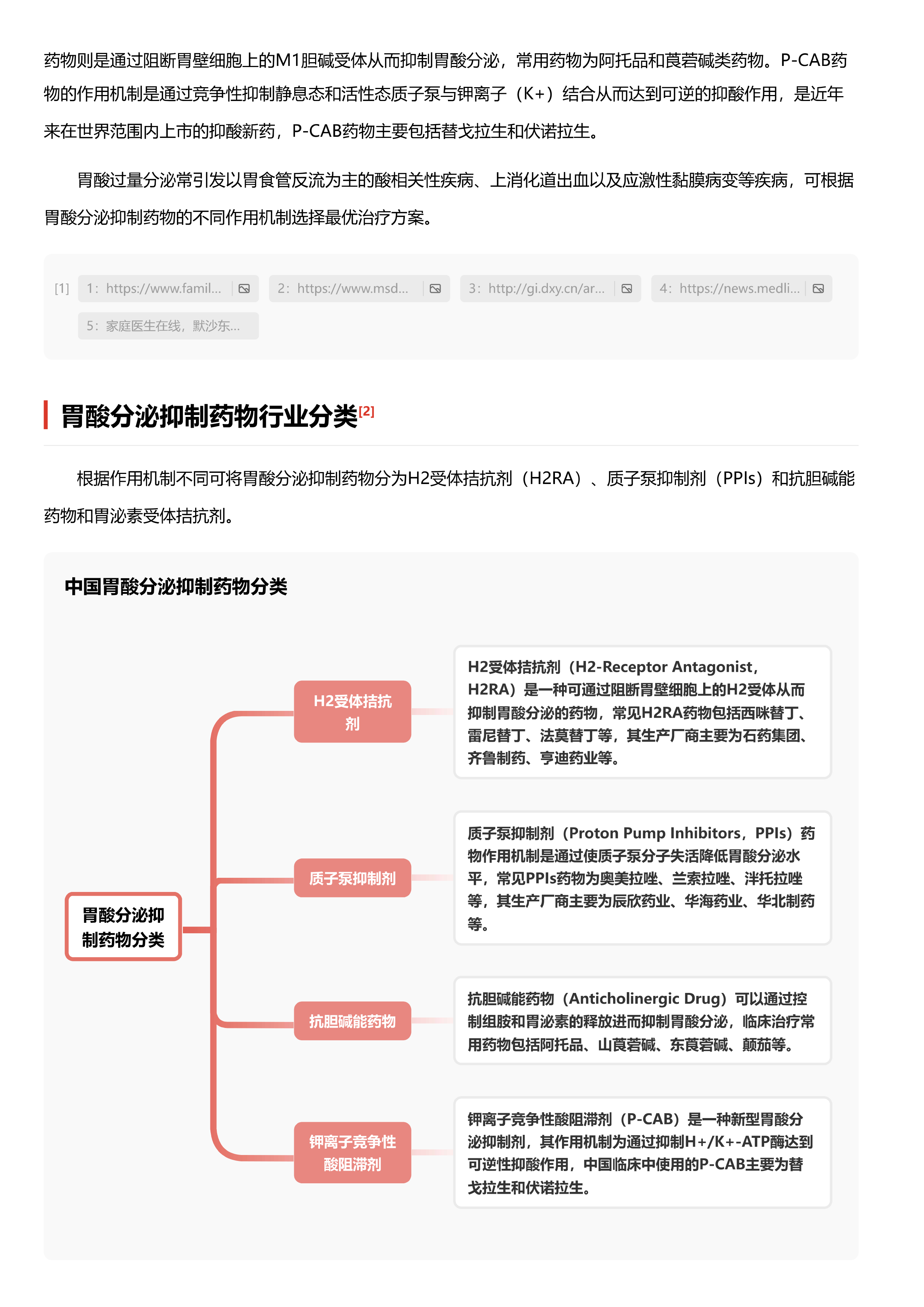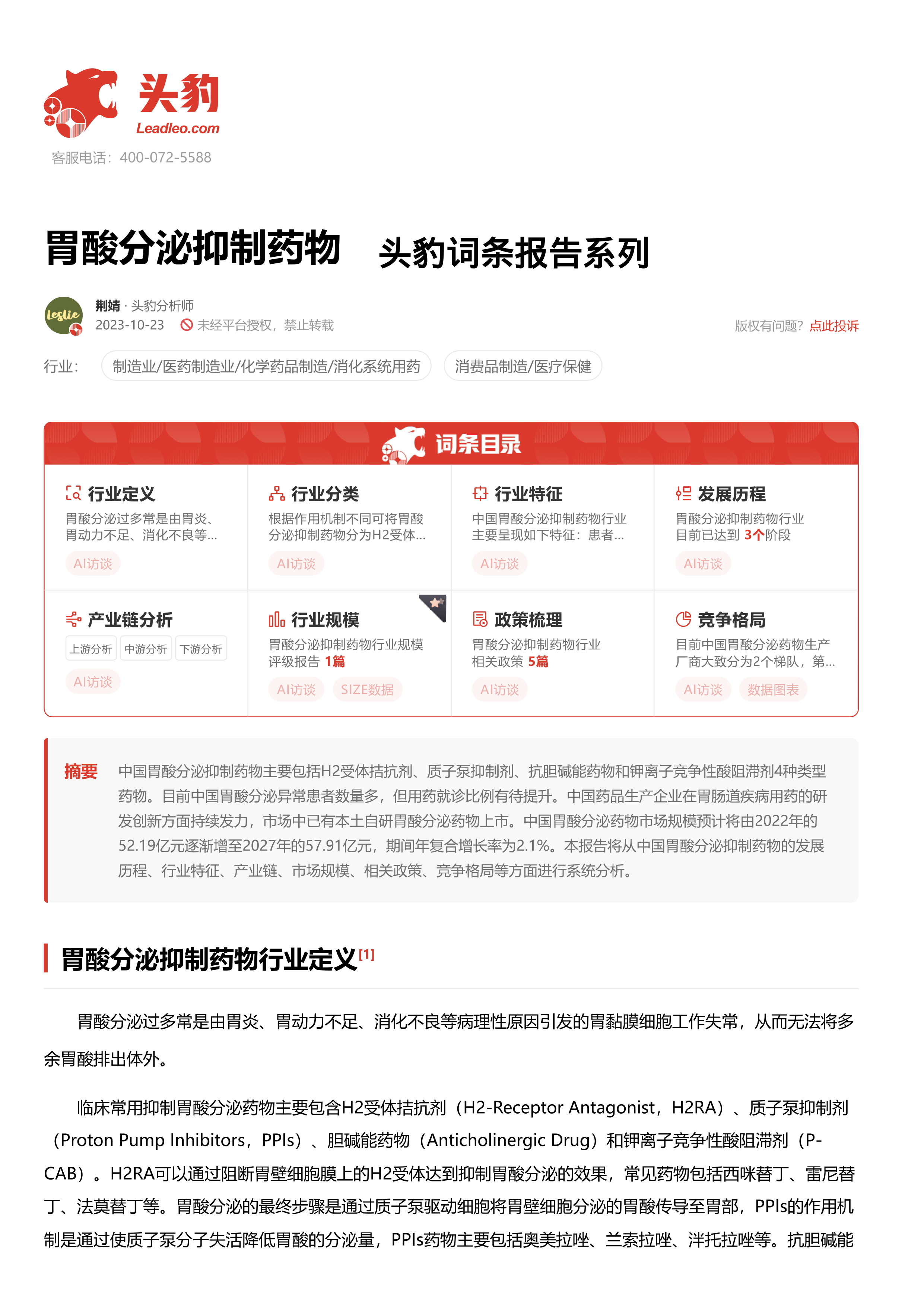 中国胃酸分泌抑制药物主要包括H2受体括抗剂、质子泵抑制剂、抗胆碱能药物和钾离子竞争性酸阻带剂4种类型药物。目前中国胃酸分泌异常患者数量多,但用药就诊比例有待提升。中国药品生产企业在胃肠道疾病用药的研发创新方面持续发力,市场中已有本土自研胃酸分泌药物上市。中国胃酸分泌药物市场规模预计将由2022年的52.19亿元逐渐增至2027年的57.91亿元,期间年复合增长率为2.1%。本报告将从中国胃酸分泌抑制药物的发展历程、行业特征、产业链、市场规模、相关政策、竞争格局等方面进行系统分析。
